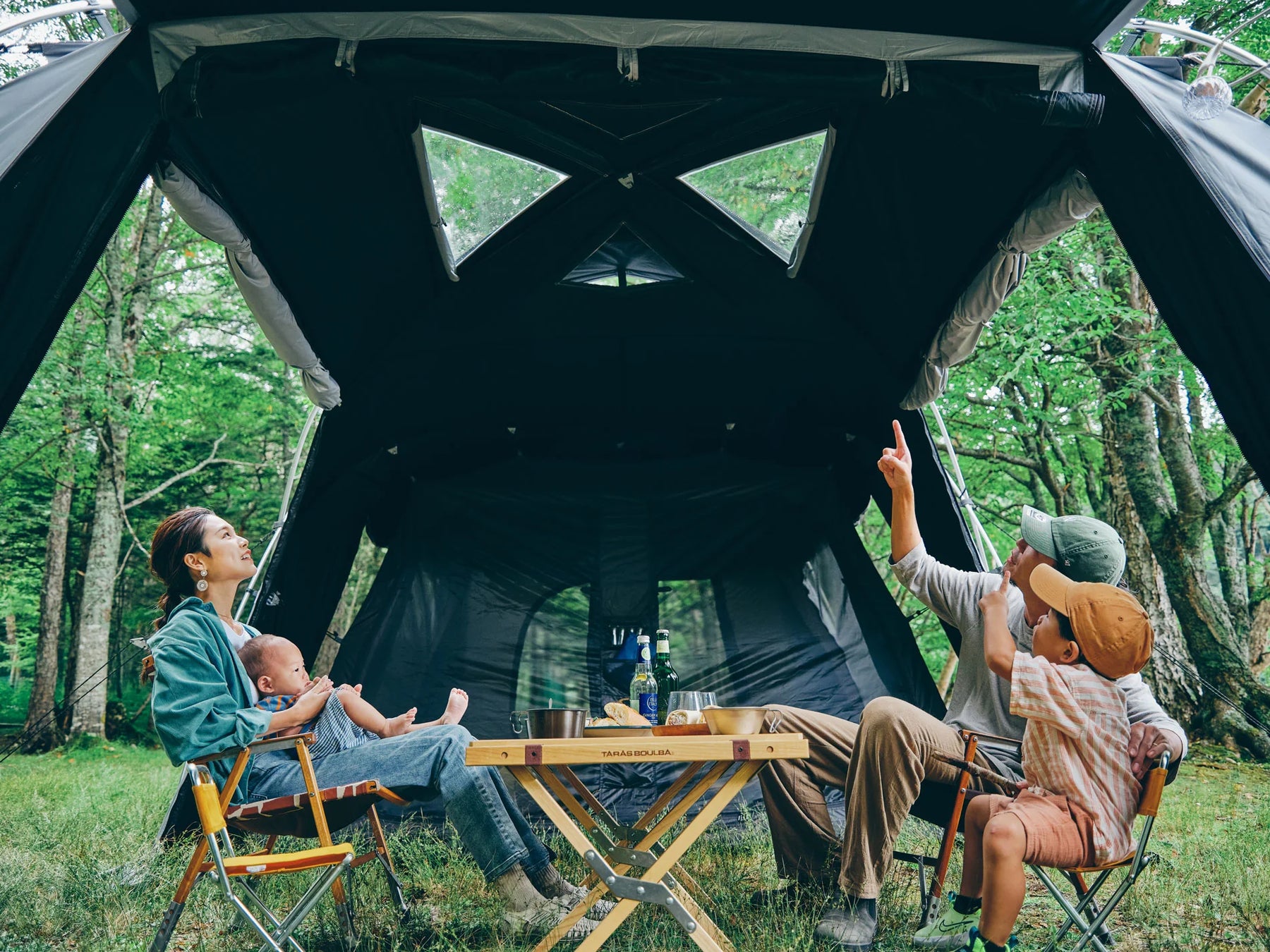 エフィカは、ファミリーキャンプやグループキャンプで快適な居住空間を実現する2ルームシェルターです。軽量ながら広い室内空間(最大210cmの天井高・横幅350cm)を確保し、テーブルやチェア、荷物を余裕で配置できます。