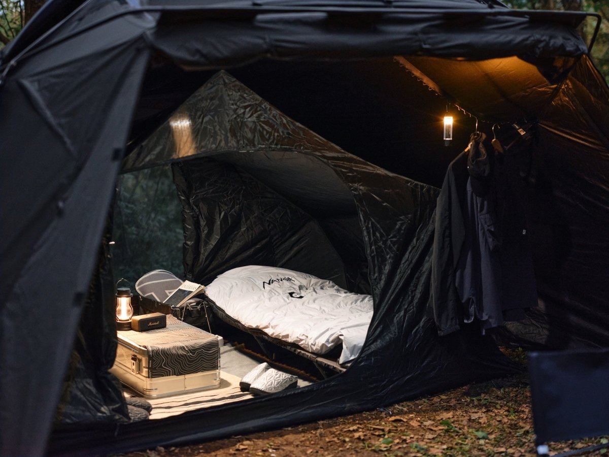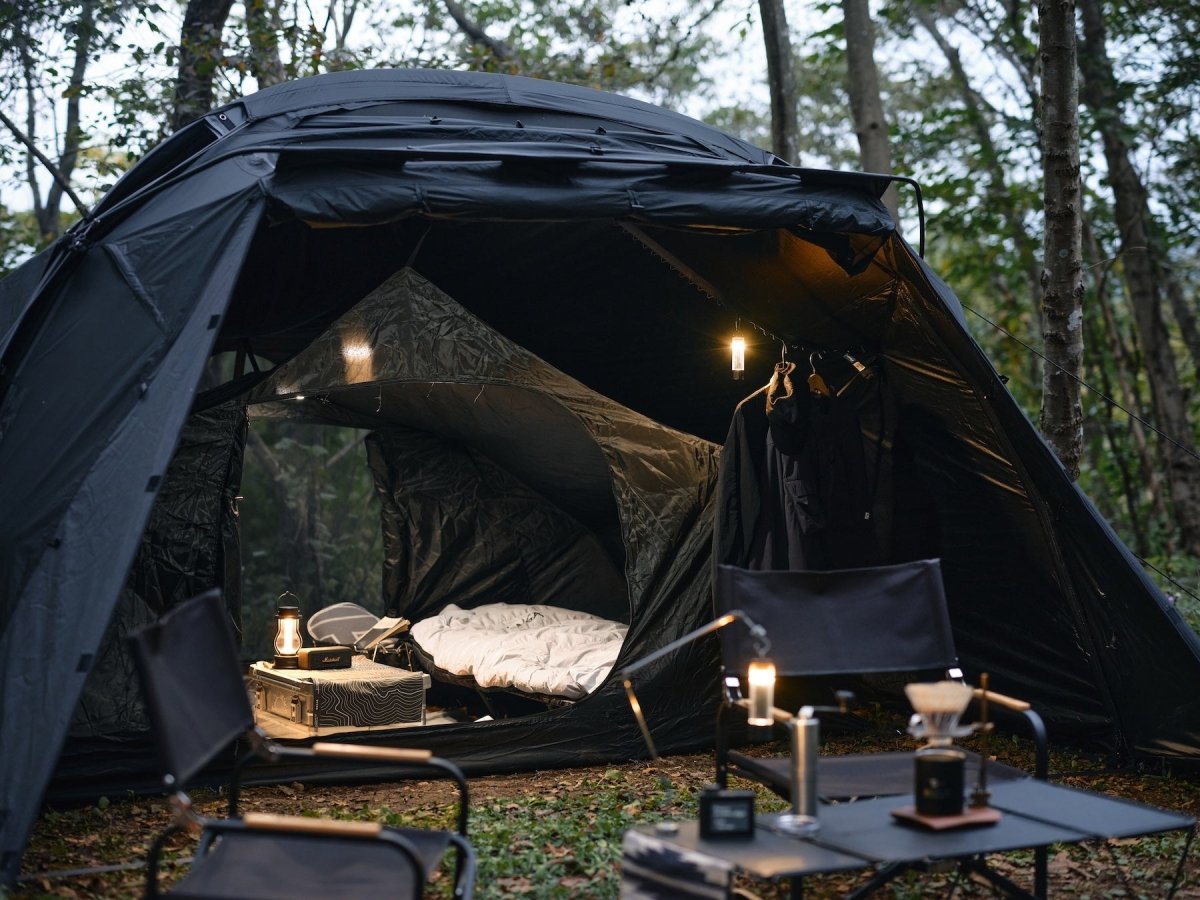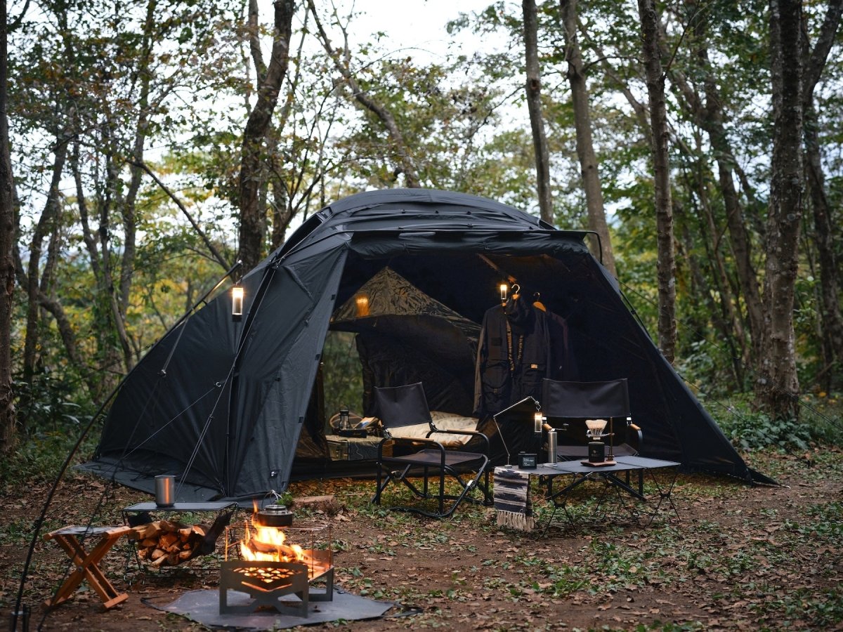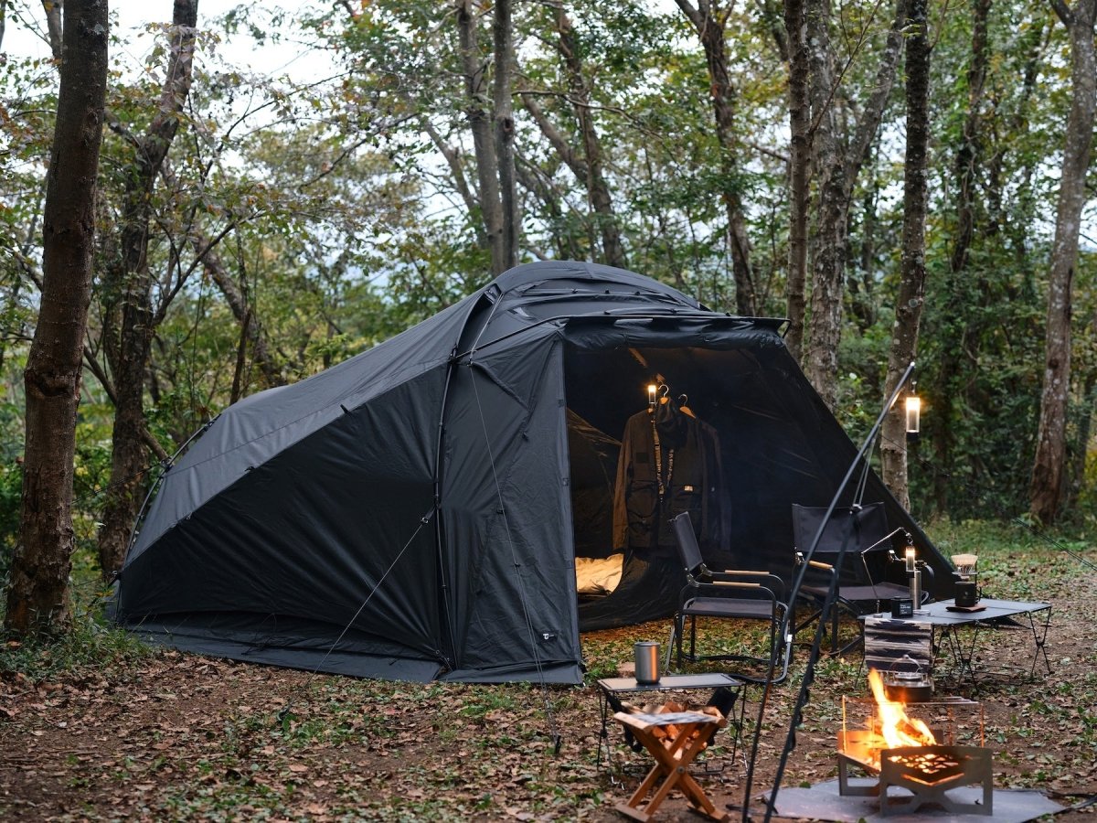 テンビシェルターは3本ポールで直感的に設営でき、女性一人でも15〜20分で完了する手軽さが大きな魅力。幕内は約2 mの天井高とワイドフロアでソロからデュオ、家族までゆったり過ごせる。四面メッシュと天窓が優れた換気と眺望を提供し、冬はストーブも置ける広さでオールシーズン快適。ブラックやグレーの洗練カラーとシャープなフォルムがサイトで映え、価格以上の質感と耐風性に満足の声が多数。ペグダウンが少なく撤収も迅速で、結露を抑えるルーフシートやインナーテントなどオプション拡張も豊富。所有欲を満たす“一軍”テントとして高評価を集めている。