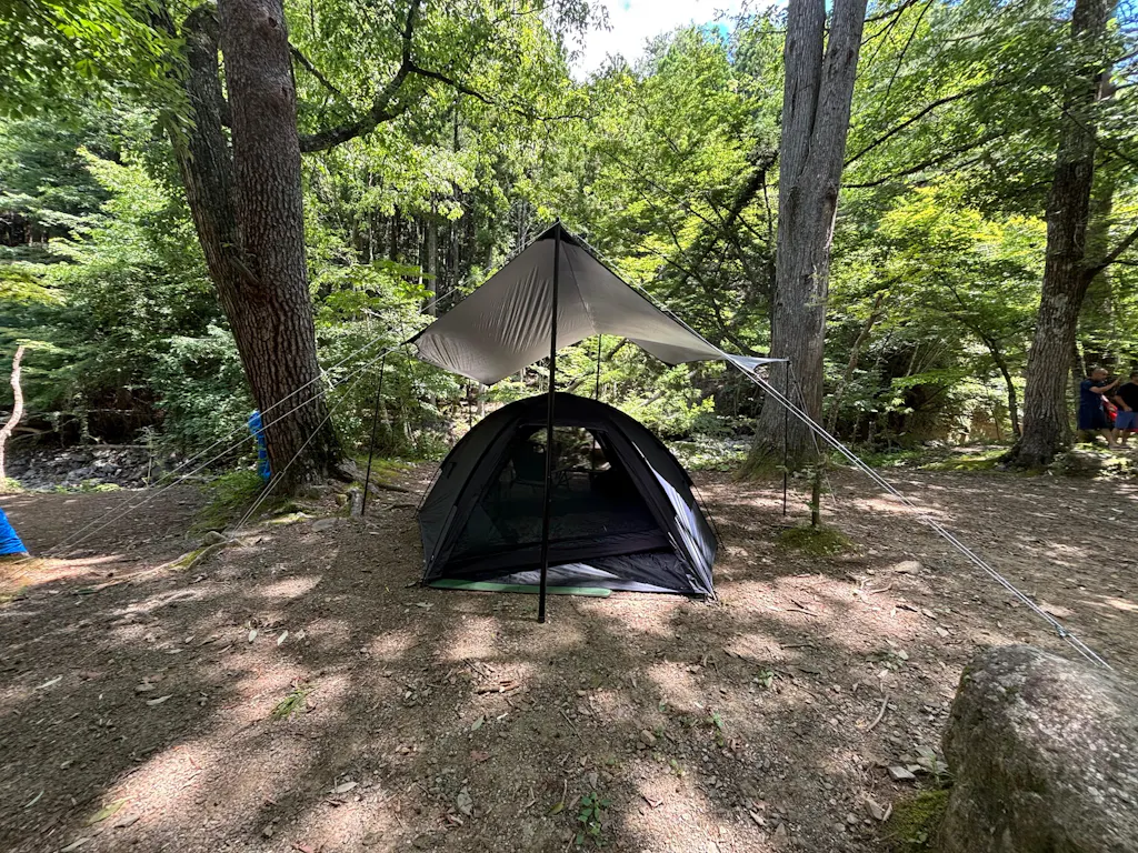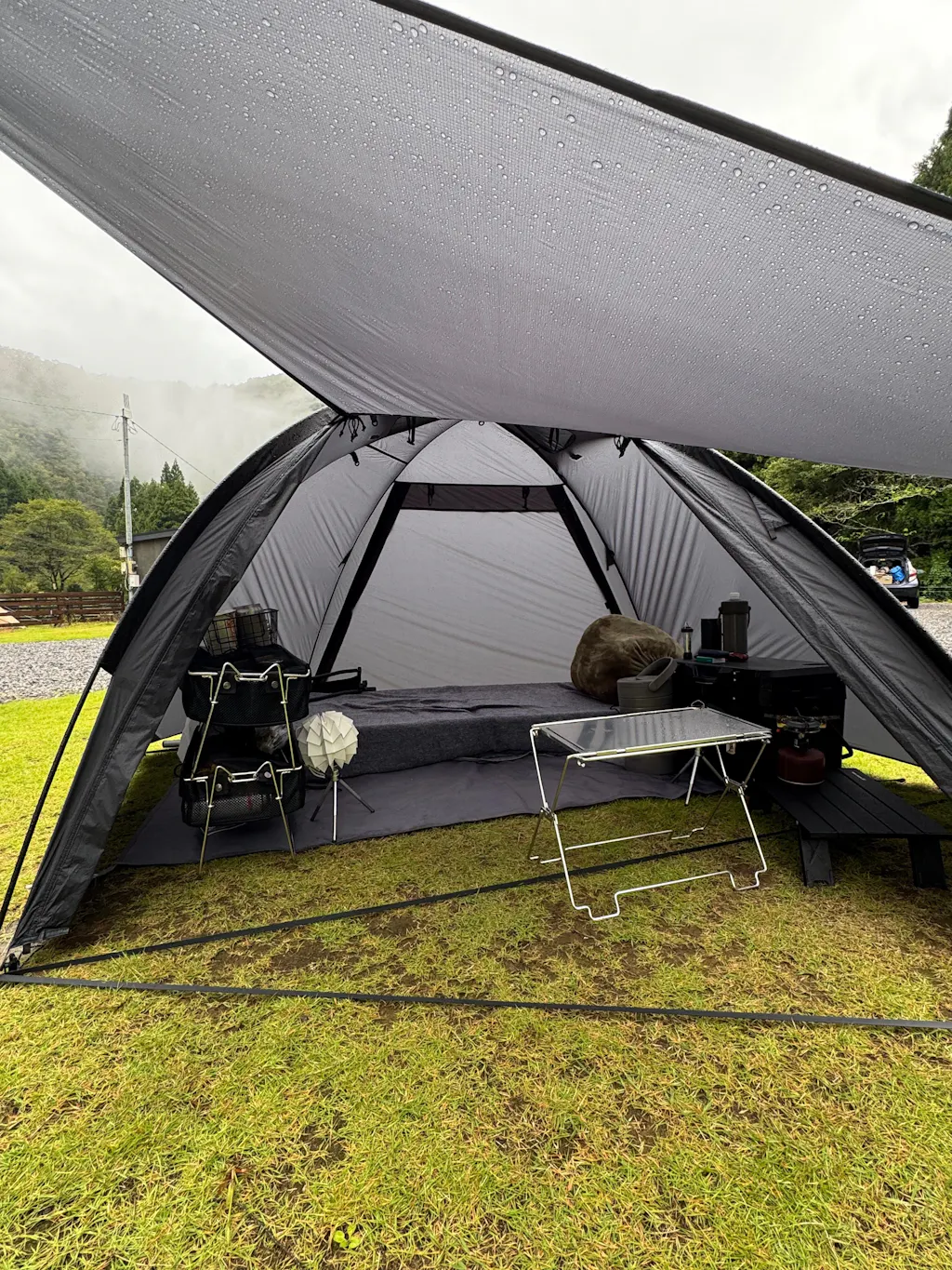また、もうひとつのポイントは広めに確保した前室です。登山テントだと最低限のスペースしかないことが多いですが、キャンプシーンでは調理や小物の整理など、テントの「外」と「内」をつなぐ中間領域が重要になります。