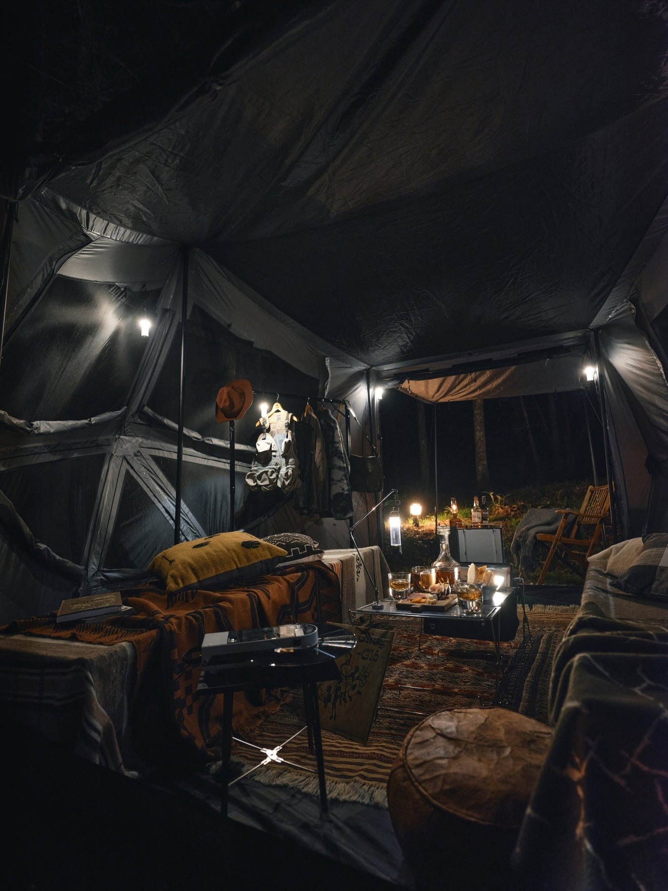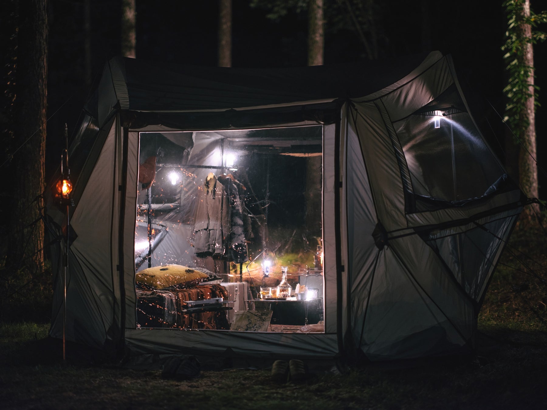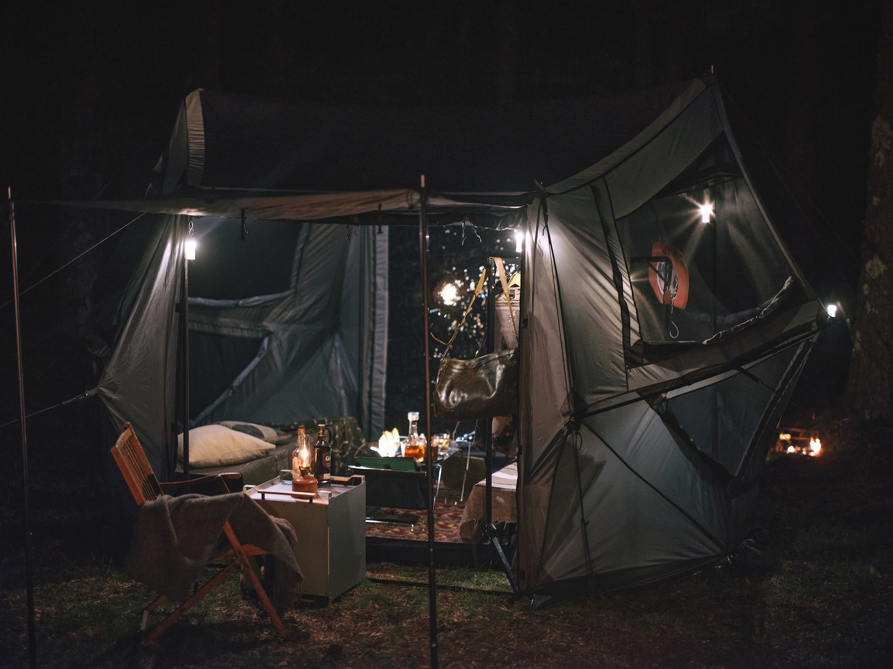 「持ち運べるグランピング」をコンセプトに、グランピングに求められる贅沢な要素を、キャンプ用シェルターに落とし込みました。