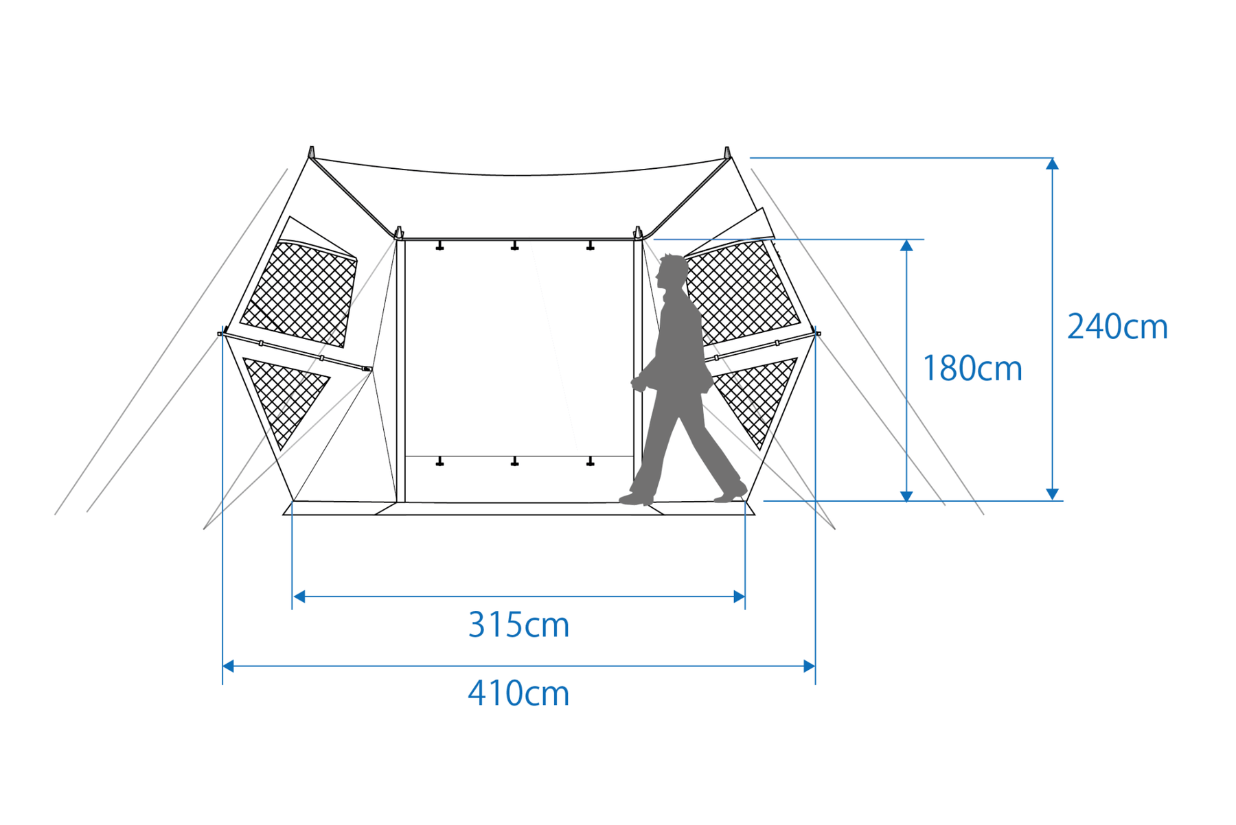 - 本体/75D ポリエステルタフタリップストップ(耐水圧2,000mm)インナールーフ/210Dポリエステルメインポール/アルミニウム合金(A6061)サブポール/アルミニウム合金(A6061)