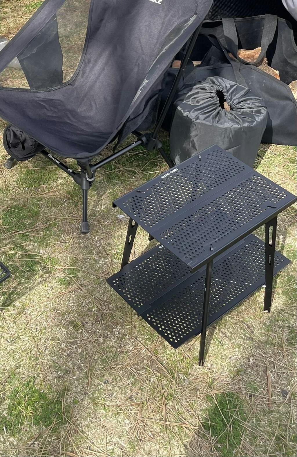 ジカテーブルは500g以下の軽量ボディと数秒で完了するワンアクション設営で、山歩きやツーリングにも難なく同行できるロースタイル用ミニテーブルです。パンチング加工のマットブラック天板は通気性と耐熱性を兼備し、OD缶・クッカー・マグを余裕で置ける横長レイアウト。収納時は薄く折りたたみギアの隙間に滑り込み、脚が天板内に収まるギミックでパッキング効率が向上。コサイドテーブルやジカマナイタと自由に組み合わせて二段化でき、サイトを統一感ある無骨スタイルに格上げすると評価されています。