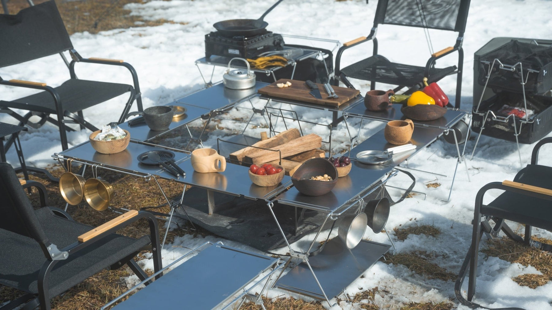 温かみがある木製テーブルは、おしゃれでナチュラルなテントサイト作りにおすすめです。