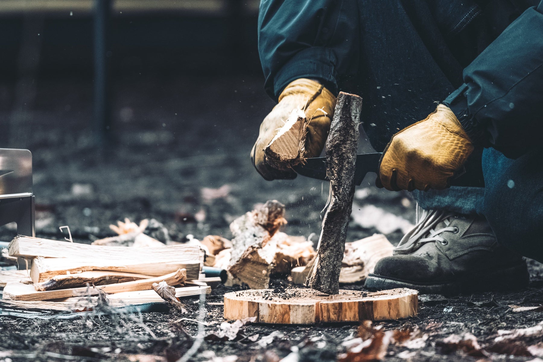 薪割り中は安全を第一に考える必要があります。グローブを着用して手を保護することは必須です。また、バトニング台を使用することでナイフが地面や石にぶつかるリスクを減らせます。