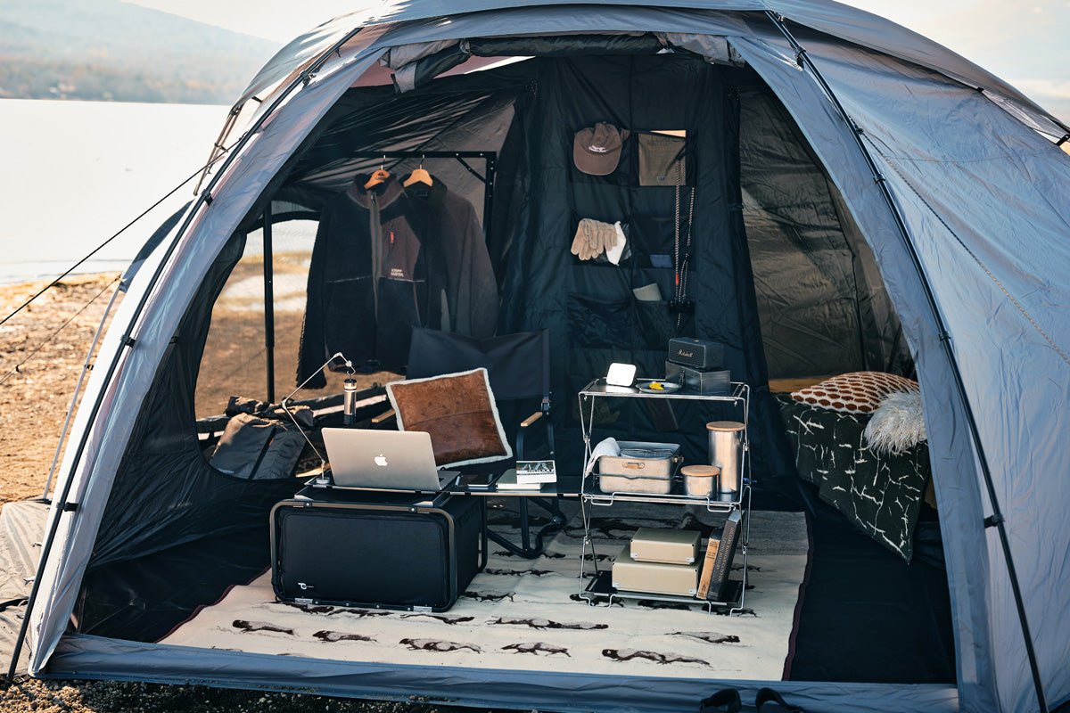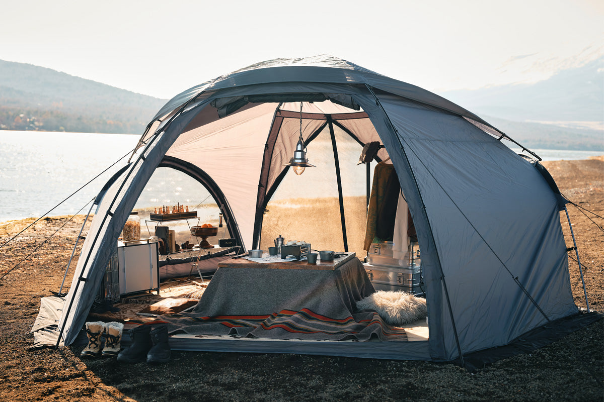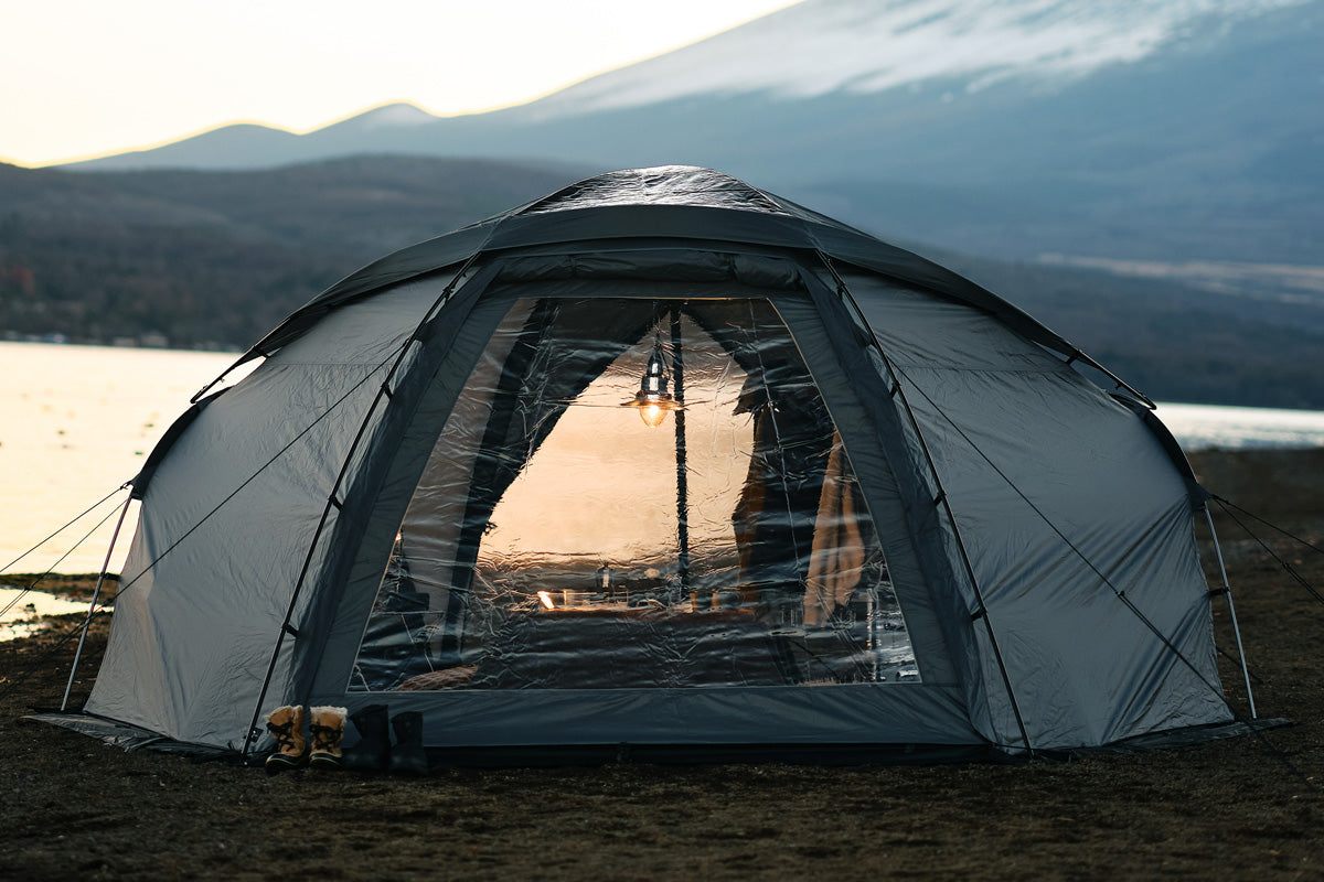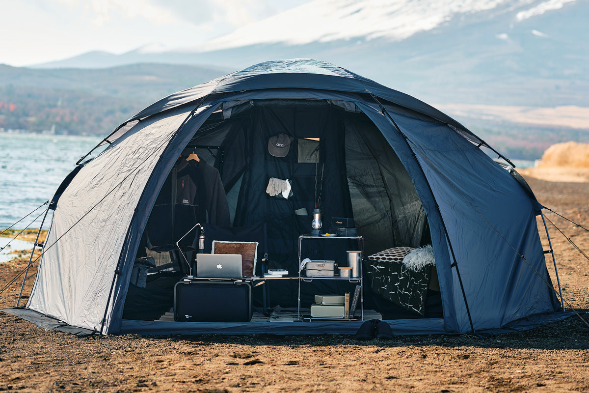 2人でゆったりとアウトドアを楽しむために設計されたドーム型シェルター。六角形に近い独自のフォルムを採用し、コットを斜めに配置できるため、テント内からも自然の景色が広がります。メッシュ窓による優れた通気性と、仕切り付きインナーテントを組み合わせることで、2人それぞれがプライベート空間を確保しつつ、広々としたリビングスペースも確保。自然に包まれながら、快適にくつろげるシェルターです。