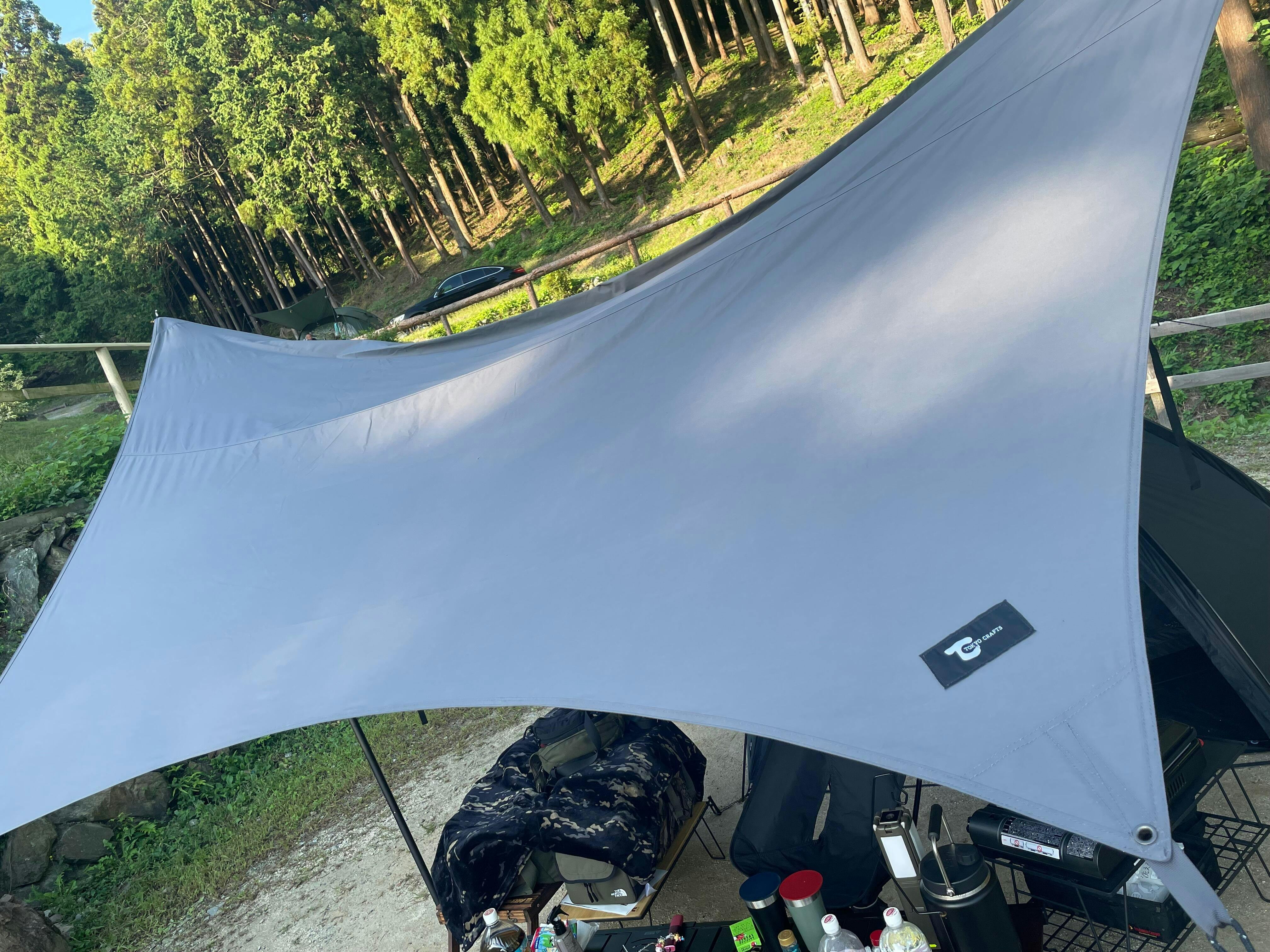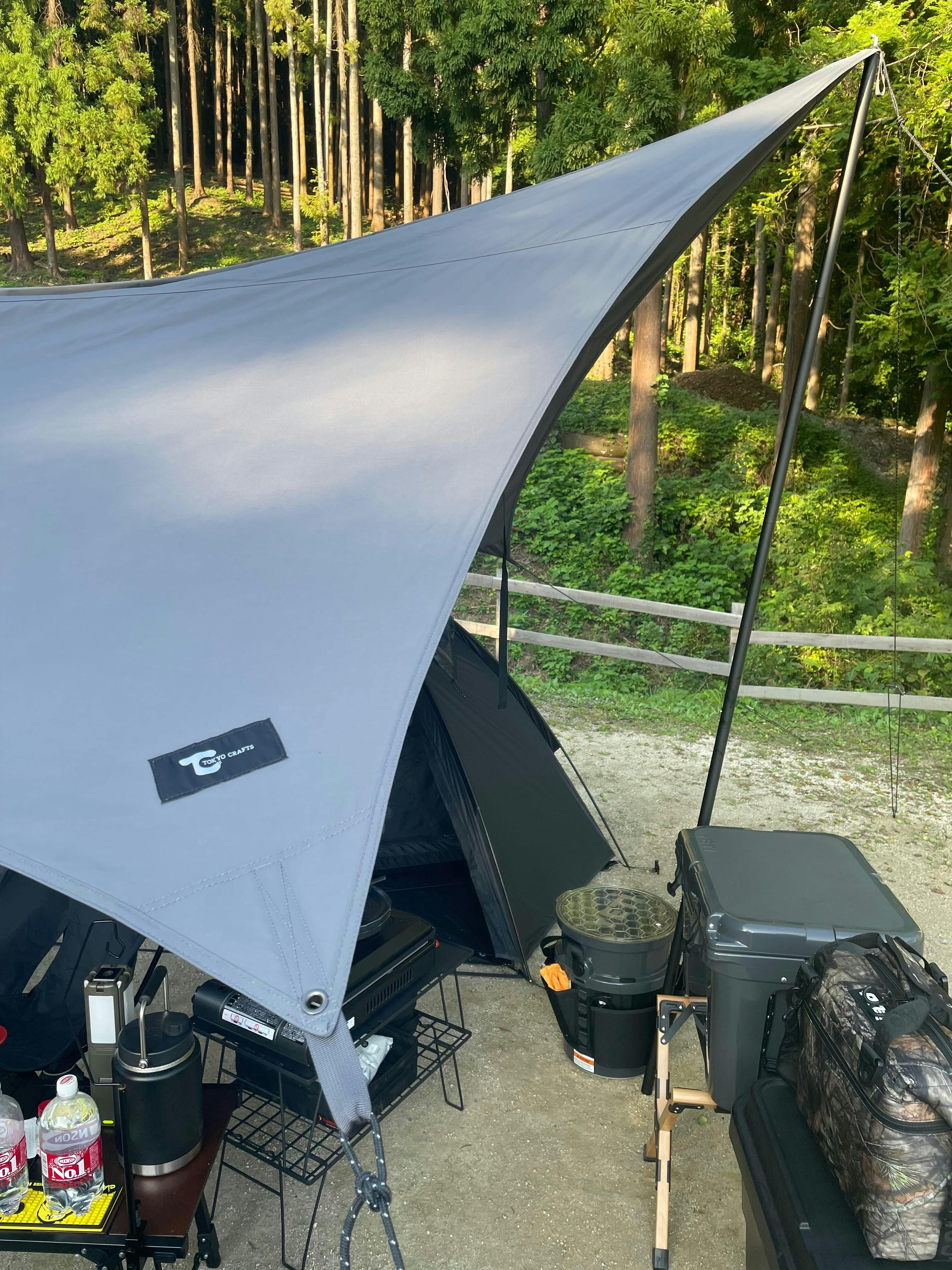 マカオン TCは、TOKYO CRAFTSらしい渋いグレーのTC素材タープ。女性ソロでも張れる直感的設営と、ソロ〜4人が快適に過ごせる絶妙サイズが好評。厚手ポリコットンが濃い影を生み火の粉にも強く、焚き火下でも安心して使える。撥水・遮光・通気性のバランスが良く、付属ガイロープや自在金具まで高品質でサイト全体を格上げ。収納ケースは余裕がありポールも一括収納でき、車載や軽バン連結にも便利。ダイヤフォートTCなど他幕とのカラー統一も容易で、サイト映えと所有欲を満たすギアとしてリピーターも多い。