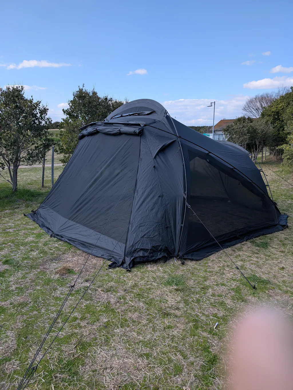 テンビシェルターは3本ポールで直感的に設営でき、女性一人でも15〜20分で完了する手軽さが大きな魅力。幕内は約2 mの天井高とワイドフロアでソロからデュオ、家族までゆったり過ごせる。四面メッシュと天窓が優れた換気と眺望を提供し、冬はストーブも置ける広さでオールシーズン快適。ブラックやグレーの洗練カラーとシャープなフォルムがサイトで映え、価格以上の質感と耐風性に満足の声が多数。ペグダウンが少なく撤収も迅速で、結露を抑えるルーフシートやインナーテントなどオプション拡張も豊富。所有欲を満たす“一軍”テントとして高評価を集めている。