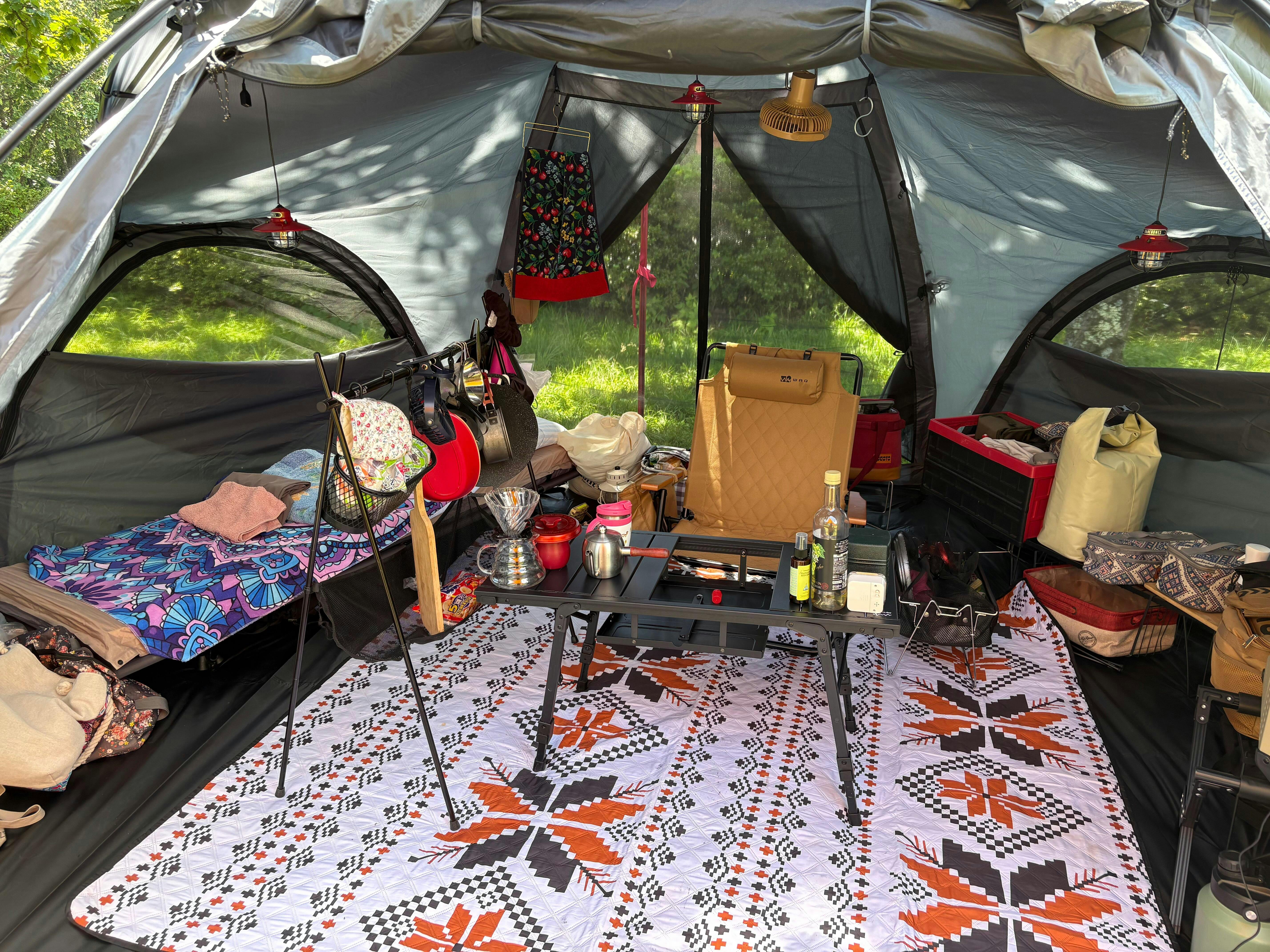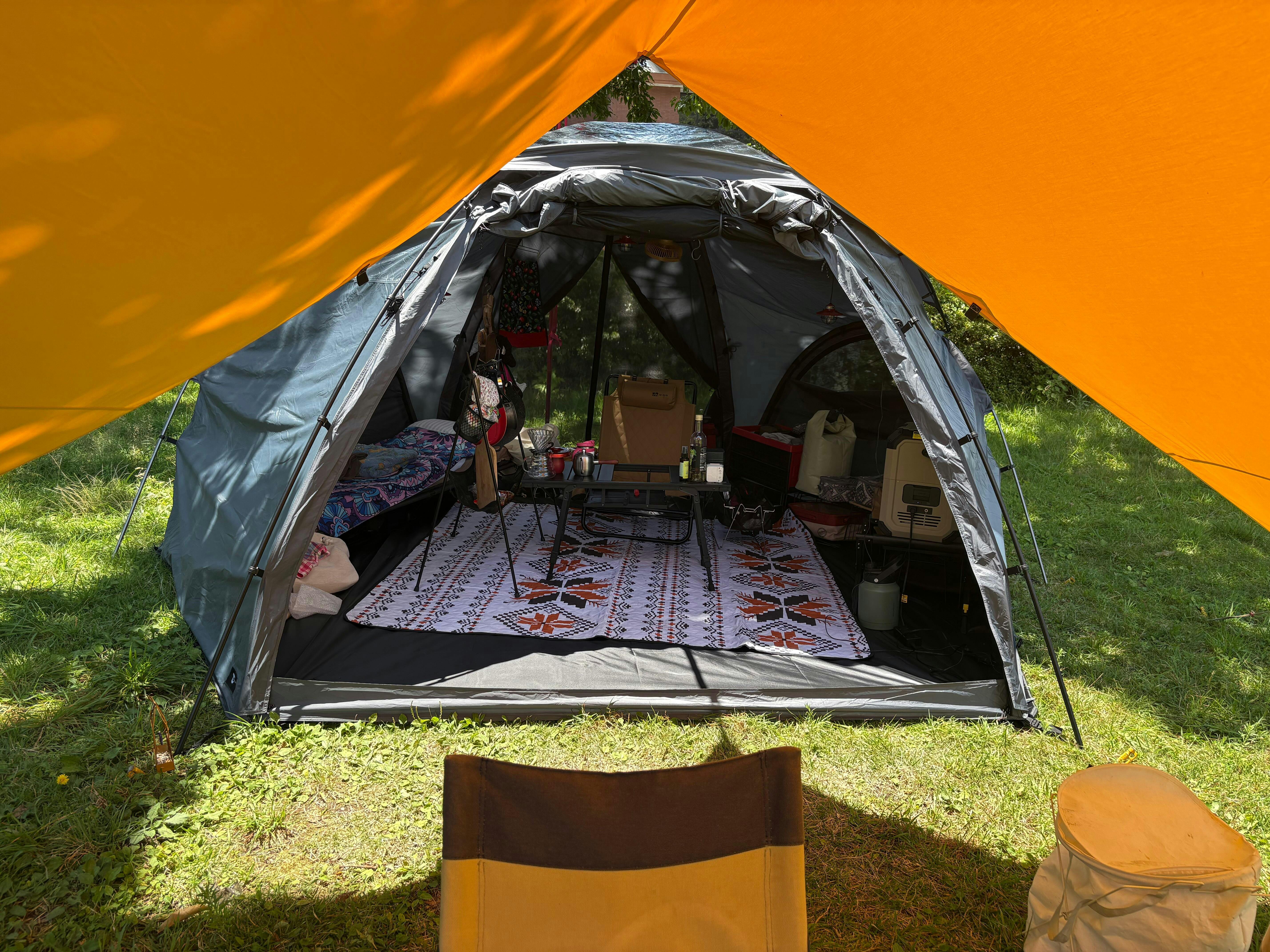 さらに、インナーテントを両サイドに寄せる形で設置するため、中央のリビングスペースはしっかり確保。テーブルや椅子を置いても余裕があるため、快適に過ごせるのも大きなポイントです。
