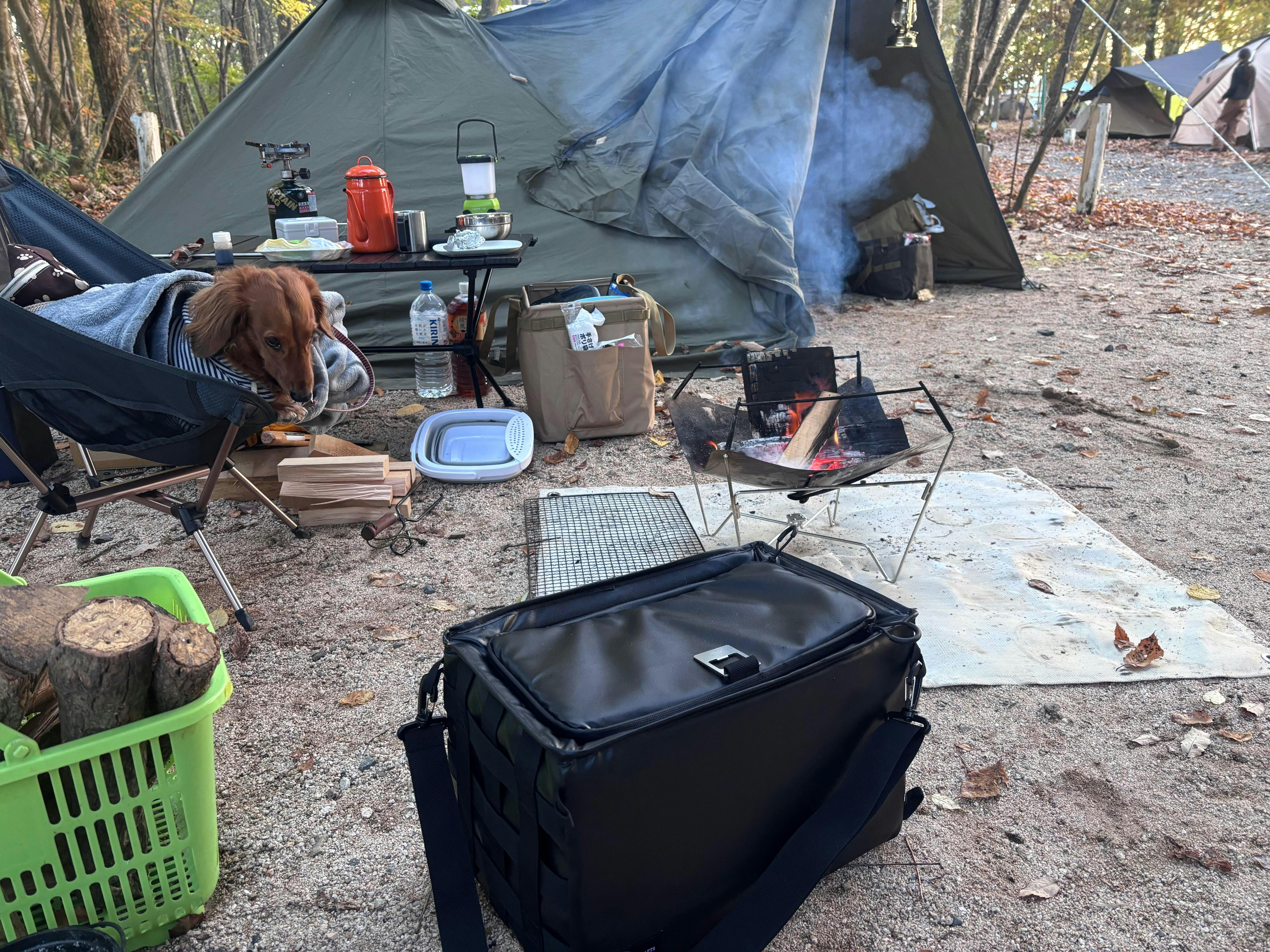 キバ ソフトクーラーは、横開きできる独自構造により椅子から立たずに飲み物を取り出せる“携帯冷蔵庫”のような快適さが魅力。コードユニットへ吊り下げればトップボードがテーブル代わりとなり、サイト全体を統一するミニマルなブラックデザインも好評です。ソロ〜デュオ向けに最適な容量で、2 Lペットボトルや食材を一泊二日分しっかり保冷。ショルダーストラップ付きで持ち運びも容易なため、車載や買い出しにも活躍します。ソフトクーラーとしては高い保冷性能と多様なレイアウト性を備え、「サイトをスマートに格上げする一軍ギア」として支持されています。