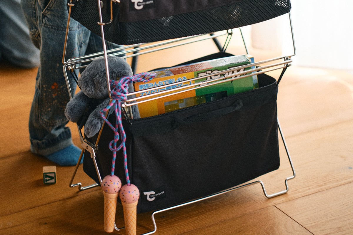 私の場合、コードユニット(脚のみ)にマルチバッグを吊り下げて、その上にバケットシェルフメッシュを置く使い方が多いです。使用頻度の高いものはバケットシェルフメッシュに、使用頻度の低いものやごみ袋はマルチバッグにという感じです。
