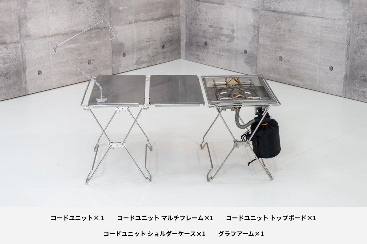 コードユニットは、ステンレスの洗練デザインとモジュール構造が生む自在なレイアウト性が魅力。テーブル・ラック・薪置きなど多用途に対応し、マルチバッグやバケットシェルフ、フラットバーナーとの連携でサイトを一気にスタイリッシュに統一できる。工具不要で設営撤収が迅速、折りたたんでコンパクトに収納可能。高い耐久性と安定感を備え、天板を追加すれば三段ラックや囲炉裏テーブルへの変形も自在。ギアを選ばないシルバーの質感がサイト全体に統一感をもたらし、リピート購入者が続出する拡張性の高いキャンプギアとして評価されている。