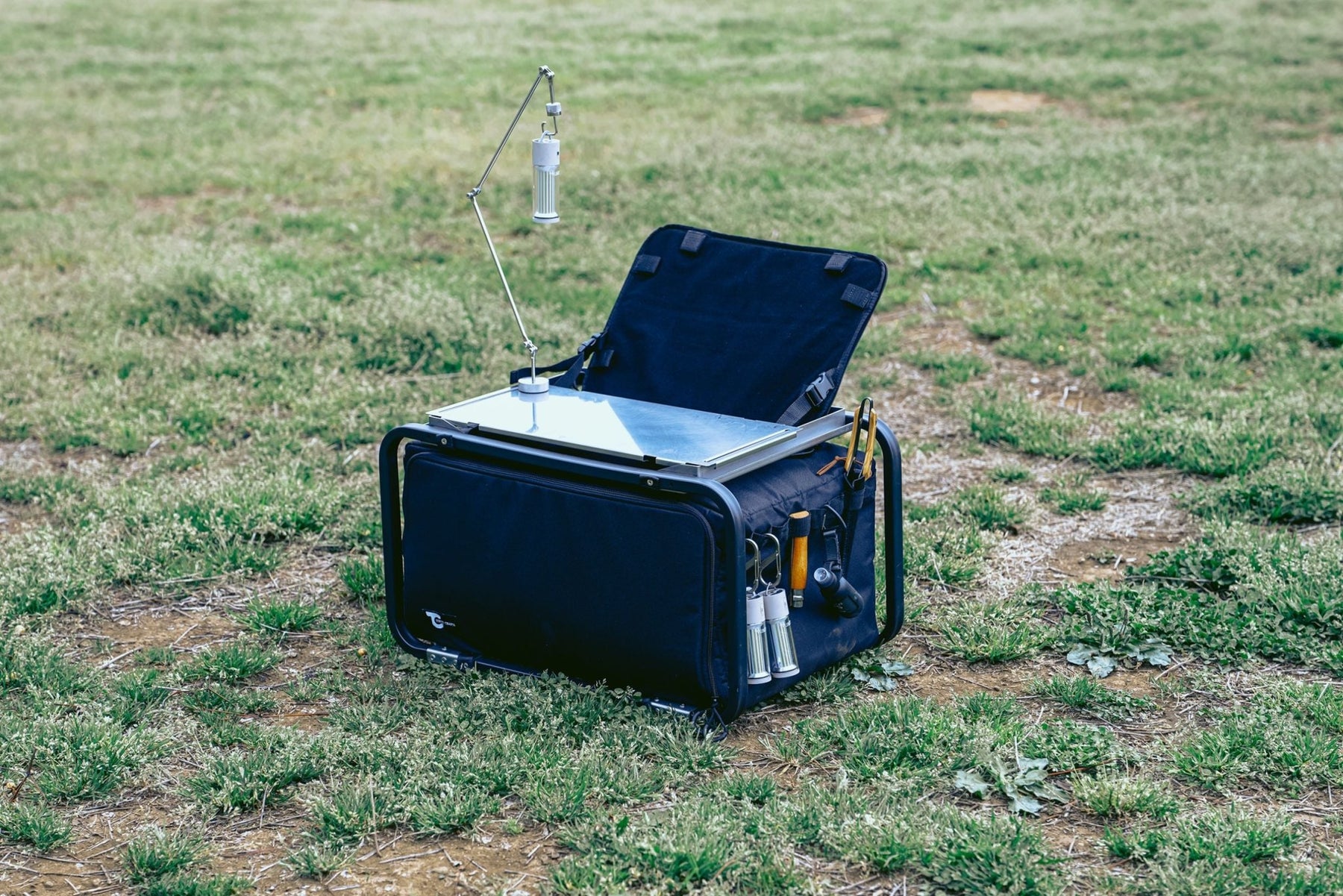 焚き火台の側やミニテーブルでは、オーガナイザーの置き場に困るときがありませんか? 特に床が濡れている場合は、置き場所に困るものです。