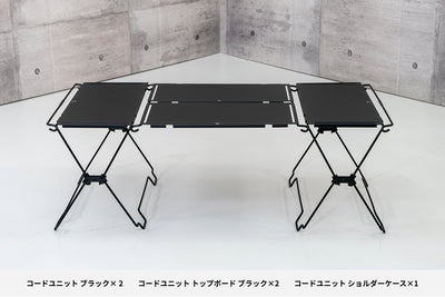コードユニット マルチバッグは、単体でも自立するボックス形状と大開口で“ガバッ”と出し入れできる使い勝手が特長。ギアや調味料、キッチンペーパー、ペグや薪束まで収まる大容量で、ファスナー付きの防水設計はダストボックス運用にも好評。コードユニットへフックオンすればテーブル下をスマートに整理でき、縦横連結や車載・旅行との相性も抜群。サイトをミニマルに整える万能収納として支持されています。