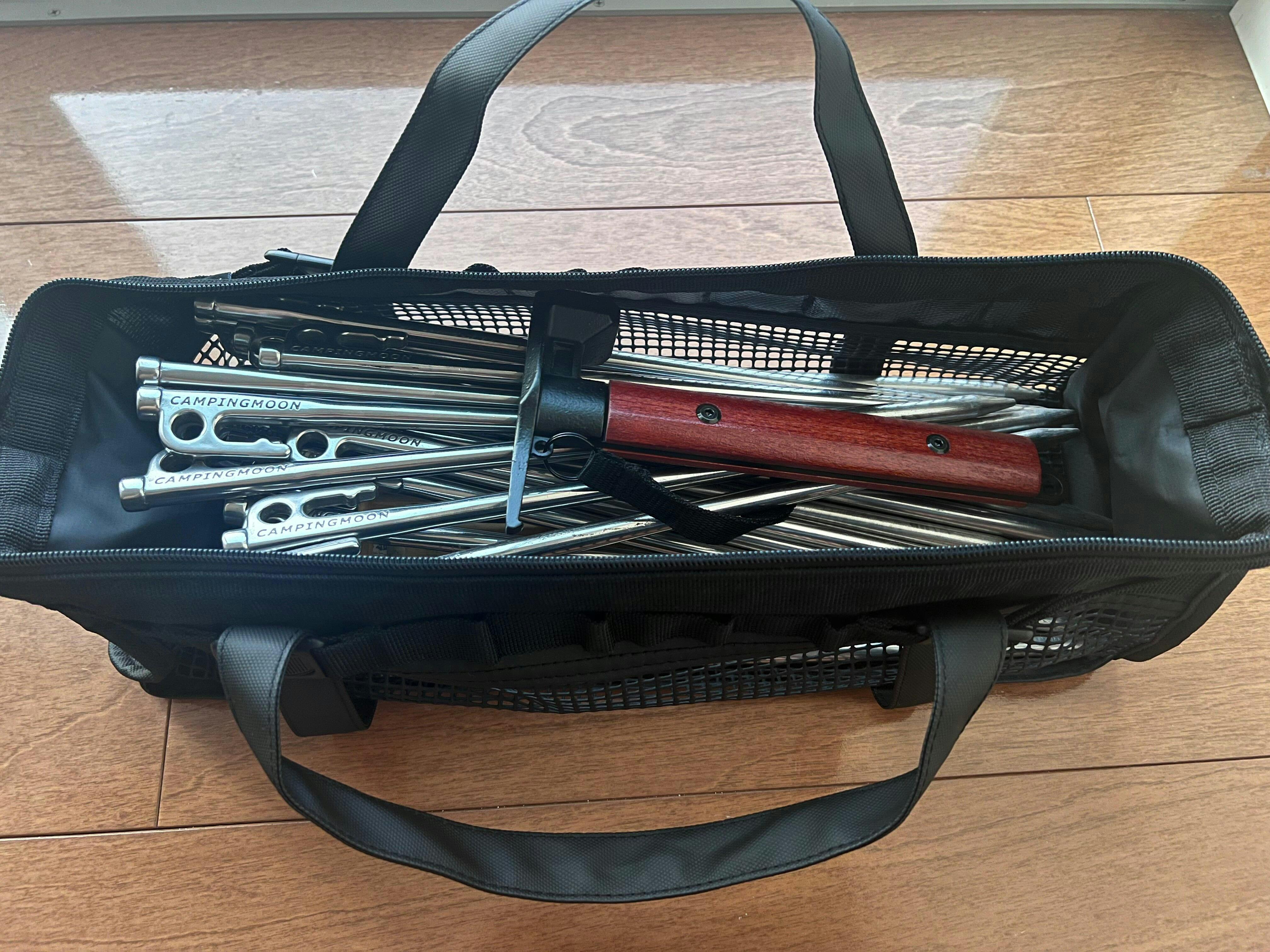 ペグやハンマーを入れやすく、形状維持のワイヤーが入っているため出し入れのストレスがありません。40cmまでの物を収納できます。