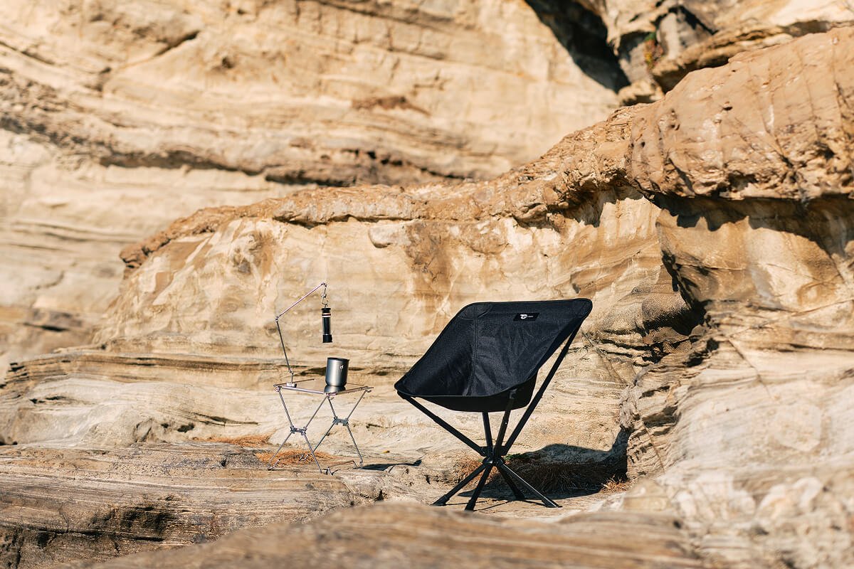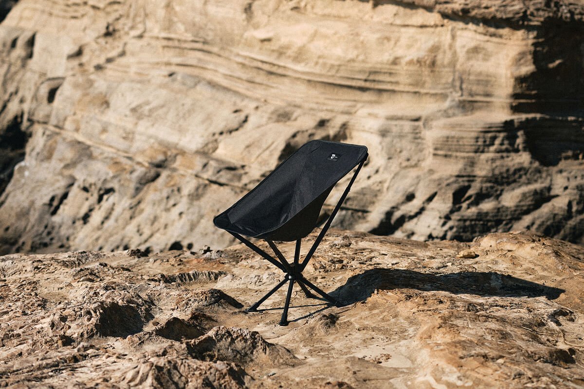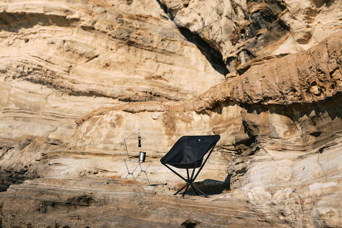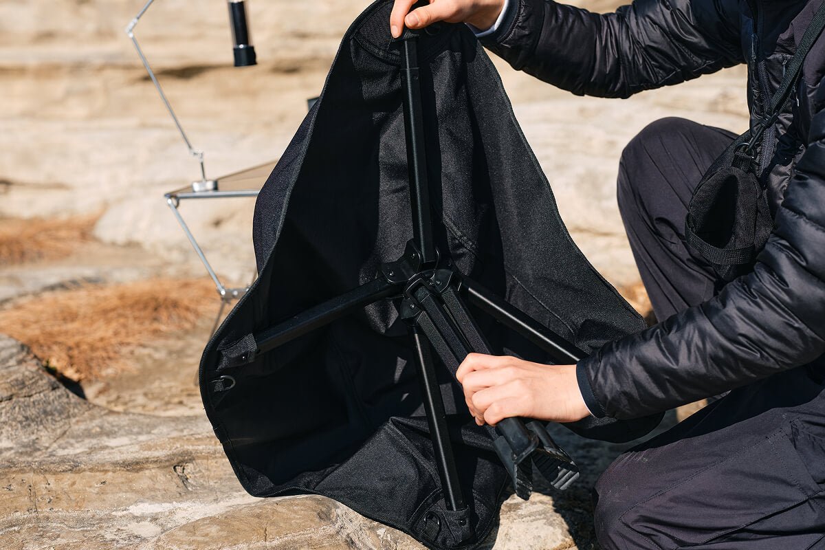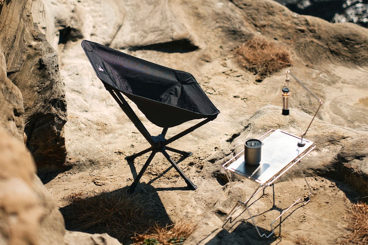 座ったままクルリと向きを変え、焚き火にもテーブルにもストレスなくアクセスできるキャンプチェアです。厚手ポリエステルの包み込む座り心地と、軽量アルミ合金フレームの剛性を両立。シートとフレームは一体型で、展開はワンアクション。収納ケースはチェア背面・側面に取り付けられ、紛失を防ぎながらポーチとしても使える新発想の“360°回るチェア”です。