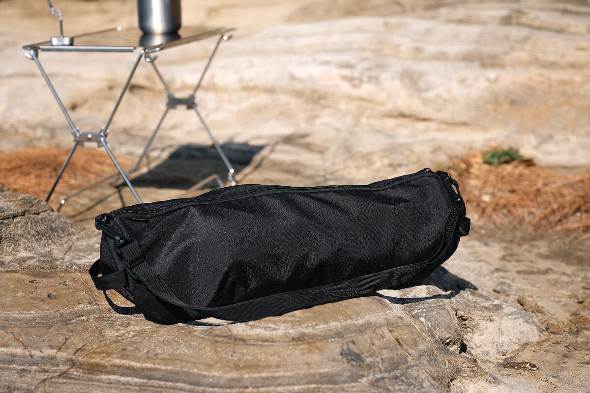 収納サイズはØ 15 × 38 cmとコンパクトな筒形に。肩掛けのベルとも付属しており、持ち運びに便利です。