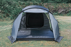 このウィングフォートは、2ルームシェルターならではの設営バリエーションの多彩さはそのままに、居住空間をトンネル型ドームテントにすることで、2ルームとドームテントの良さをどちらも手に入れた、全く新しい2ルームシェルターです。