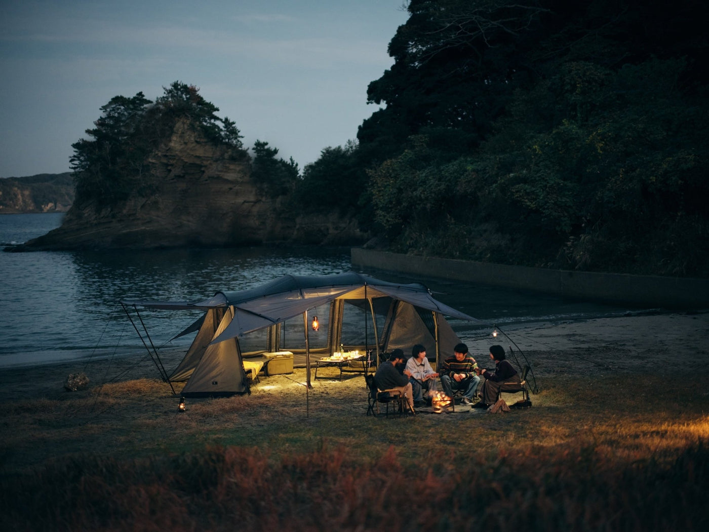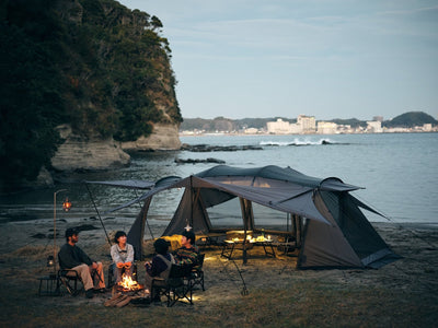 ウィングフォートは、グレー×ブラックの独創的なフォルムと多彩なアウターパネルで、タープ不要の開放スタイルからフルクローズの秘密基地まで自在に変形できる2ルームテント。天井高があるため屈まずに行き来でき、広いリビングと台形インナーでファミリーでもゆったり。四面メッシュとスカートが季節に応じた通気・遮光を両立し、頑丈なポール構造が強風時も安心。設営は動画を見れば初心者でも30分程度で完了し、跳ね上げバリエーションを試すたびにサイト映えとキャンプの楽しさが増すと好評。10万円以下でこの仕様というコストパフォーマンスも高く評価されている。