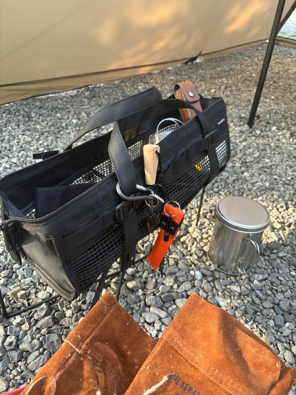 エアドライ ペグケースは、メッシュ構造でペグを入れたまま丸洗い・自然乾燥できる時短ギアです。40 cmクラスの鍛造ペグやハンマーまで大量収納でき、ガバッと開くファスナーで出し入れもスムーズ。軽量ながらタフな生地と底部タオルポケットが車載時の水滴対策をサポートし、無骨なブラックデザインがサイトを引き締めます。初めて専用ケースを購入したユーザーからも「今までで一番使いやすい」「長く愛用できそう」と高く評価されています。