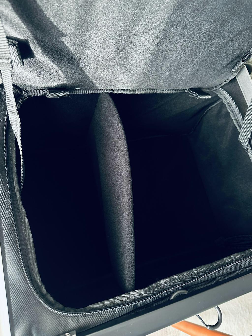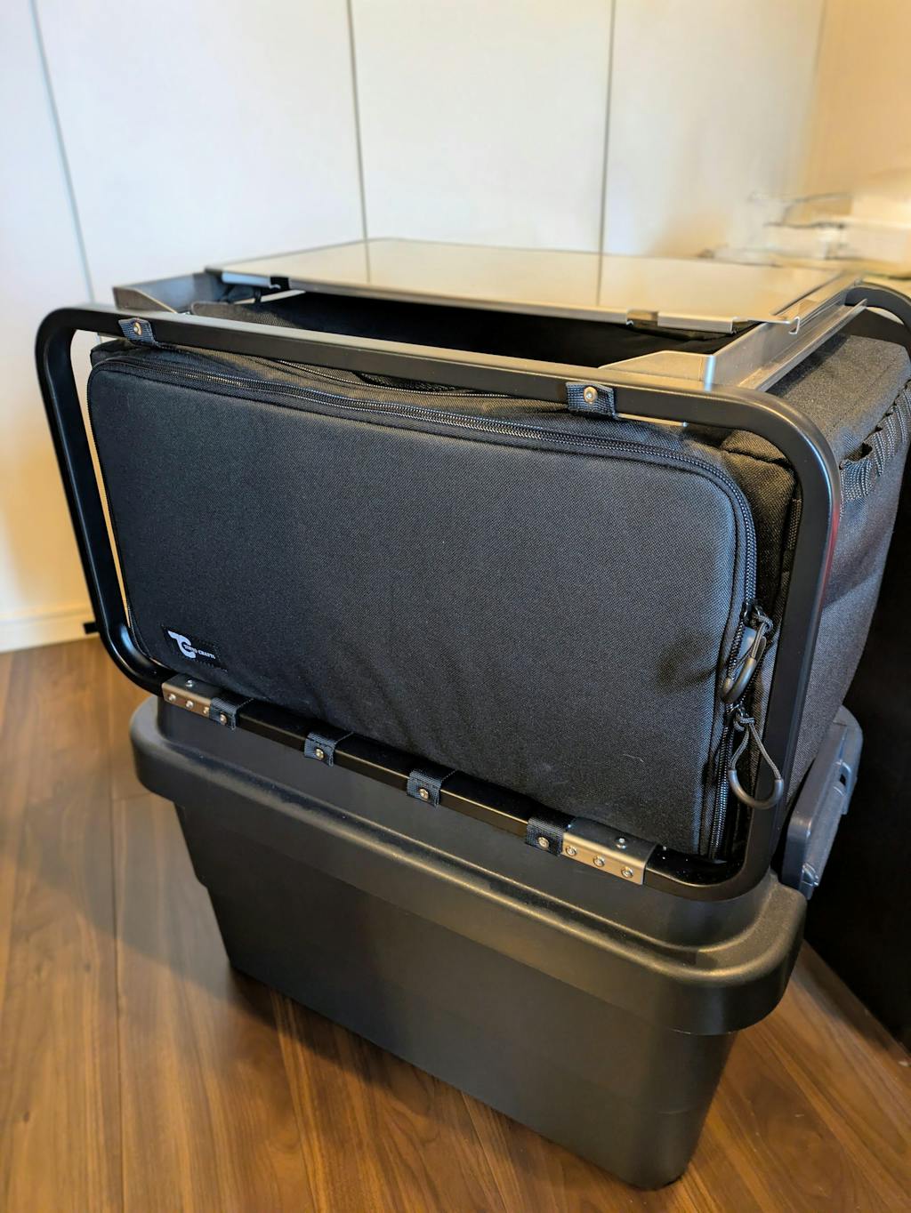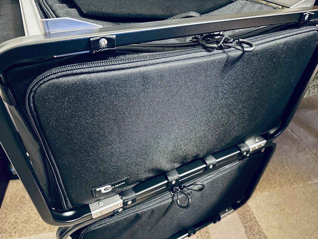 アルミフレームを採用することで、2段に重ねても十分な強度を確保しつつ、大切なギアをファブリックが優しく保護。