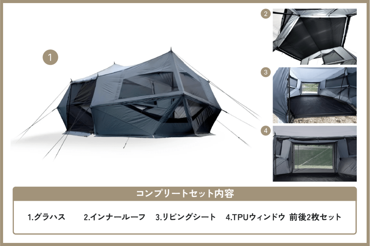 「持ち運べるグランピング」をコンセプトに、グランピングに求められる贅沢な要素を、キャンプ用シェルターに落とし込みました。