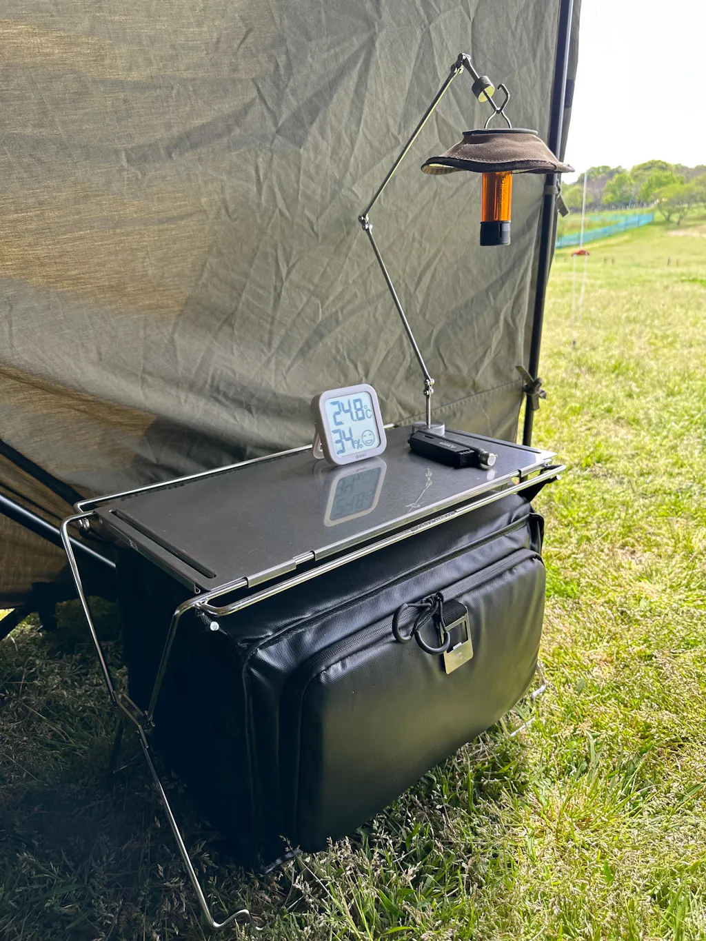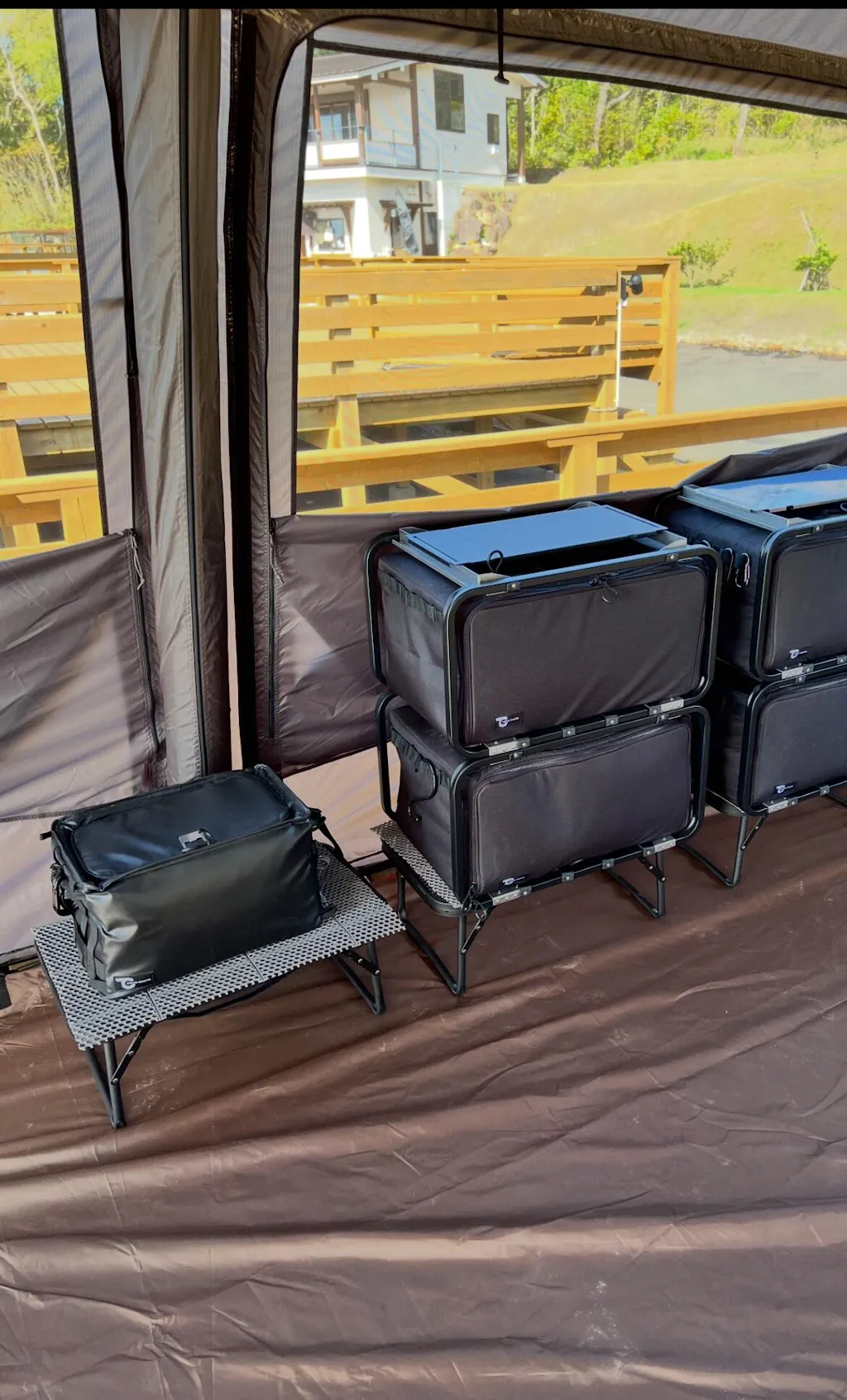 キバ ソフトクーラーは、横開きできる独自構造により椅子から立たずに飲み物を取り出せる“携帯冷蔵庫”のような快適さが魅力。コードユニットへ吊り下げればトップボードがテーブル代わりとなり、サイト全体を統一するミニマルなブラックデザインも好評です。ソロ〜デュオ向けに最適な容量で、2 Lペットボトルや食材を一泊二日分しっかり保冷。ショルダーストラップ付きで持ち運びも容易なため、車載や買い出しにも活躍します。ソフトクーラーとしては高い保冷性能と多様なレイアウト性を備え、「サイトをスマートに格上げする一軍ギア」として支持されています。