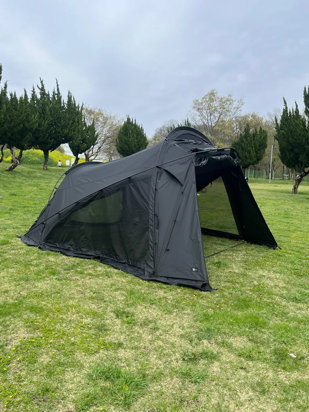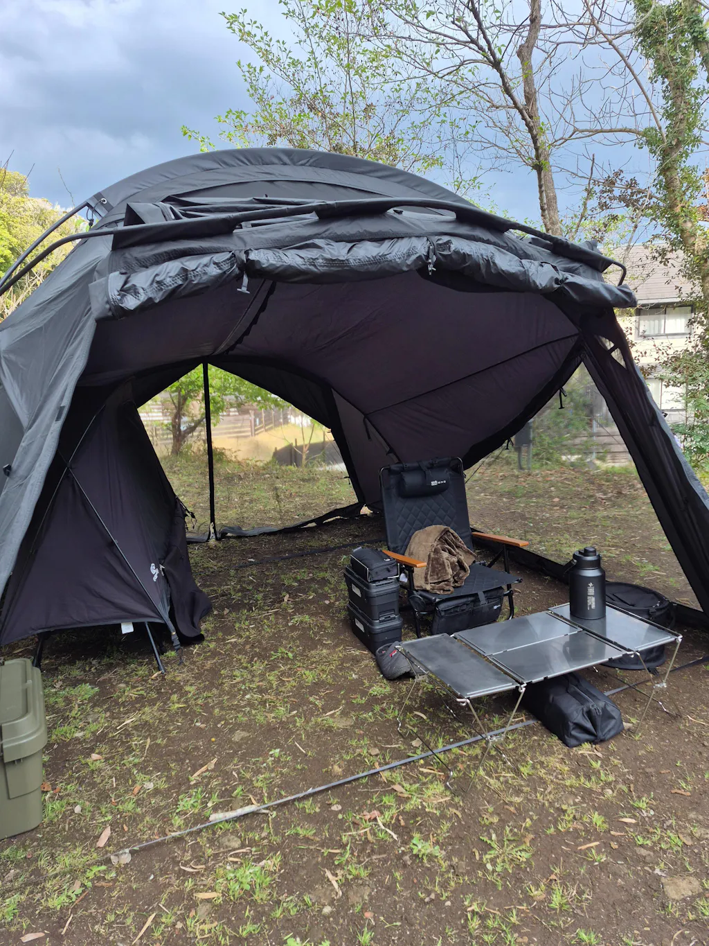 テンビシェルターは3本ポールで直感的に設営でき、女性一人でも15〜20分で完了する手軽さが大きな魅力。幕内は約2 mの天井高とワイドフロアでソロからデュオ、家族までゆったり過ごせる。四面メッシュと天窓が優れた換気と眺望を提供し、冬はストーブも置ける広さでオールシーズン快適。ブラックやグレーの洗練カラーとシャープなフォルムがサイトで映え、価格以上の質感と耐風性に満足の声が多数。ペグダウンが少なく撤収も迅速で、結露を抑えるルーフシートやインナーテントなどオプション拡張も豊富。所有欲を満たす“一軍”テントとして高評価を集めている。