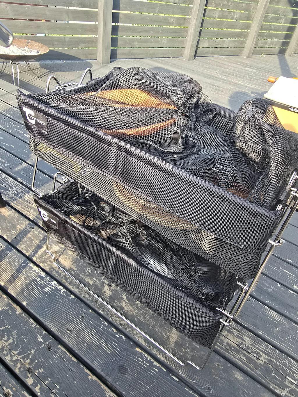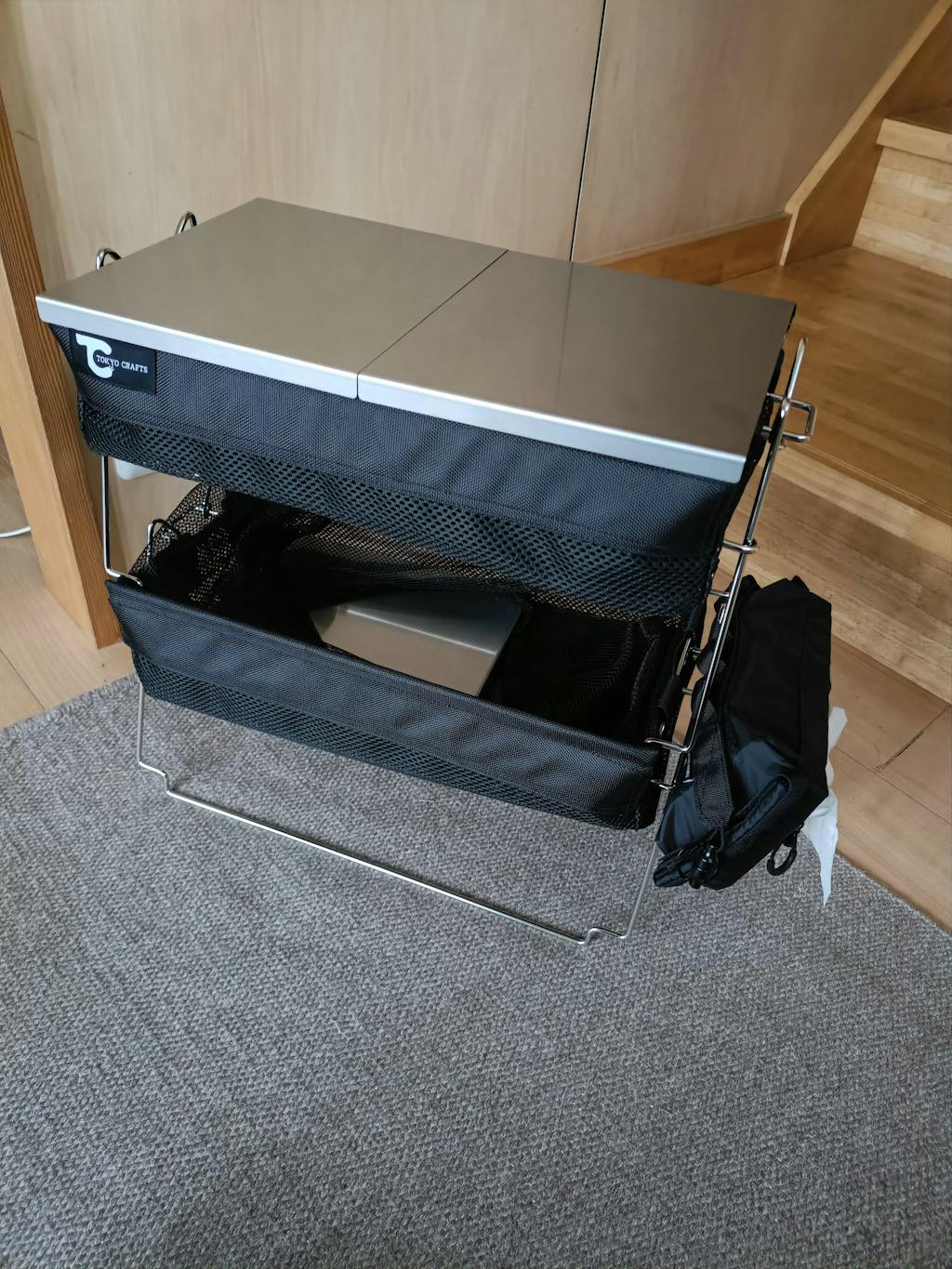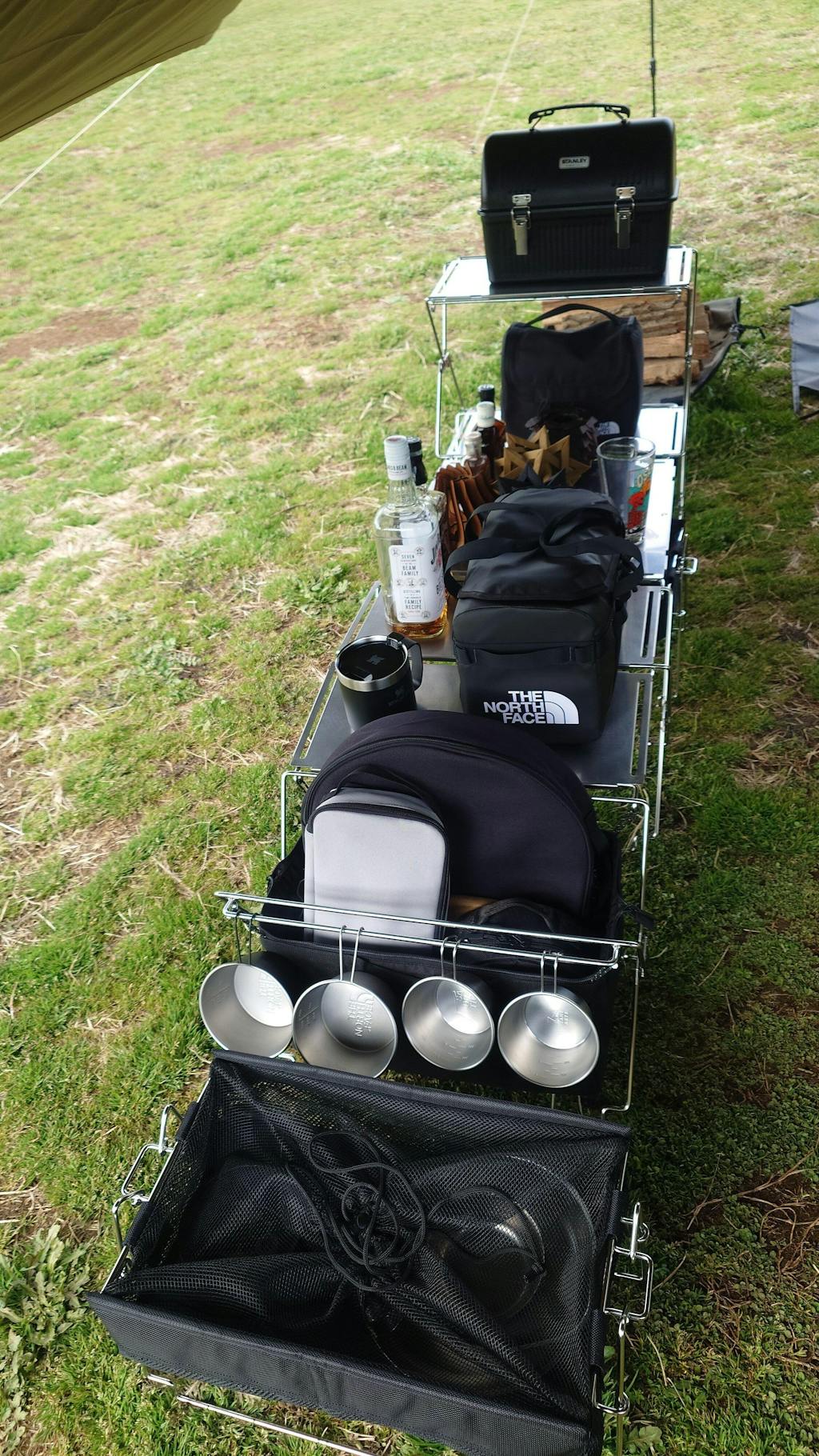 雑然とした生活感のある物を、どんどん入れても、メッシュのカバーをふんわり被せれば無骨ギアの仲間入り!脚の形も色々変えられるので車内での積載時とサイトについてから、形を変えて使い勝手がとてもいいです。我が家は大抵2段重ねで使っています。