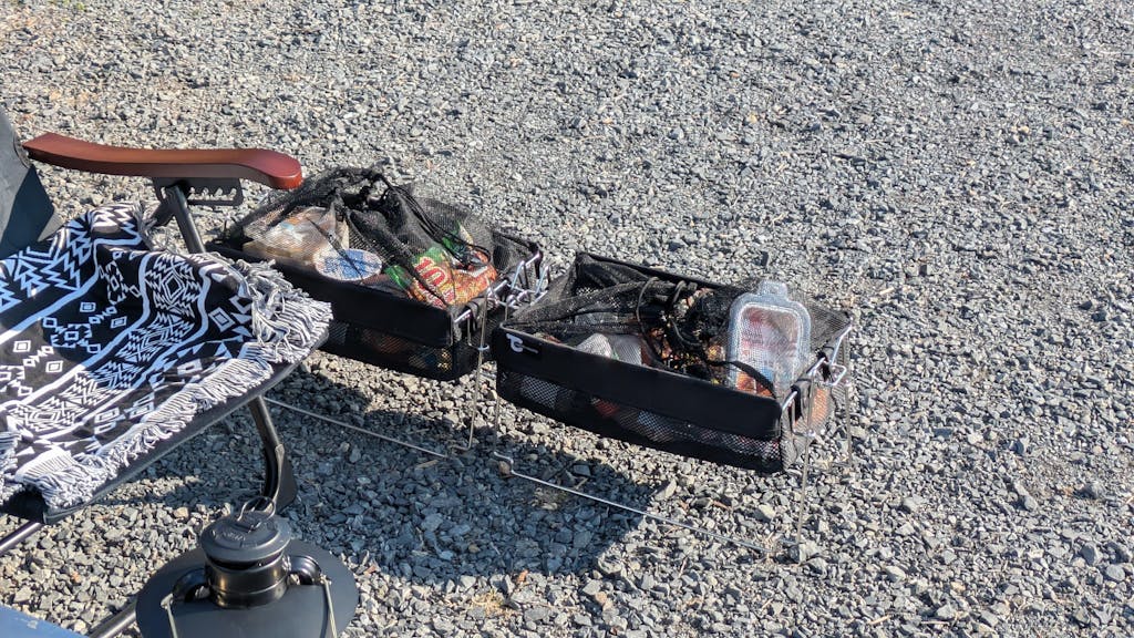 バケットシェルフメッシュは、軽量ながら収納力抜群のメッシュバスケットで、シェラカップや食材などをたっぷり放り込んだまま持ち手を返してそのままサイトへ運搬可能。メッシュ巾着で中身が見やすく飛散も防止し、2個重ねてスタッキングすればテーブル脇やコードユニット下にぴったり収まりスペースを有効活用できる。組み立てはワンタッチで安定感も高く、ブラック基調のシンプルデザインがサイトを引き締め、小物整理が一気に片付いてサイト映えも抜群。キャンプだけでなく室内のベッドサイドやクローゼット整理にも活躍し、万能ギアとして高評価を得ている。