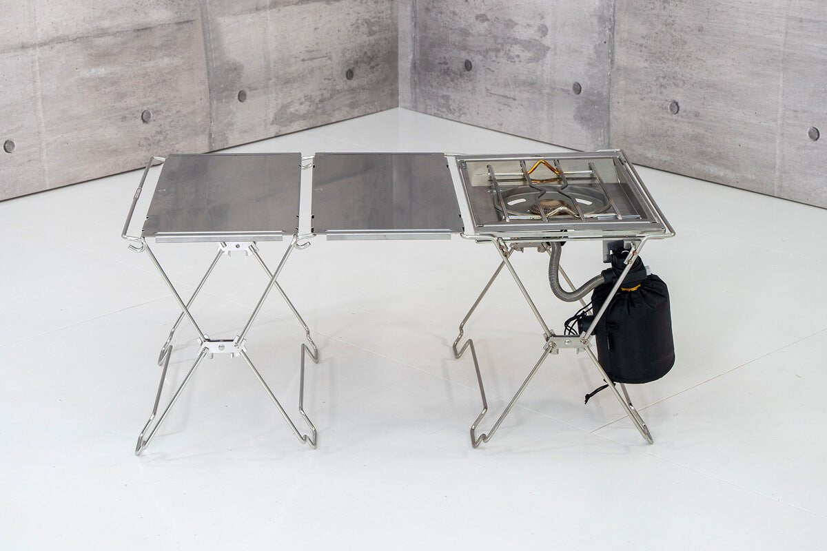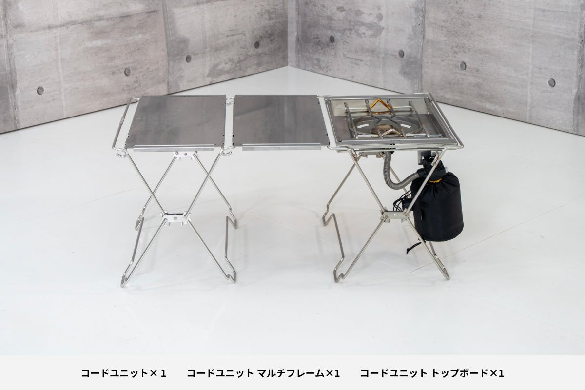 コードユニットは、ステンレスの洗練デザインとモジュール構造が生む自在なレイアウト性が魅力。テーブル・ラック・薪置きなど多用途に対応し、マルチバッグやバケットシェルフ、フラットバーナーとの連携でサイトを一気にスタイリッシュに統一できる。工具不要で設営撤収が迅速、折りたたんでコンパクトに収納可能。高い耐久性と安定感を備え、天板を追加すれば三段ラックや囲炉裏テーブルへの変形も自在。ギアを選ばないシルバーの質感がサイト全体に統一感をもたらし、リピート購入者が続出する拡張性の高いキャンプギアとして評価されている。