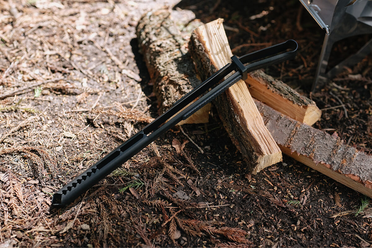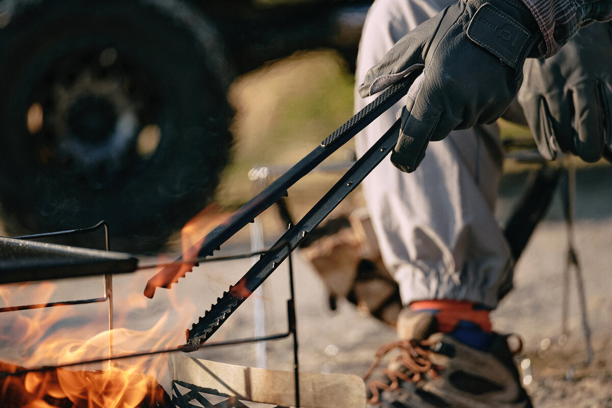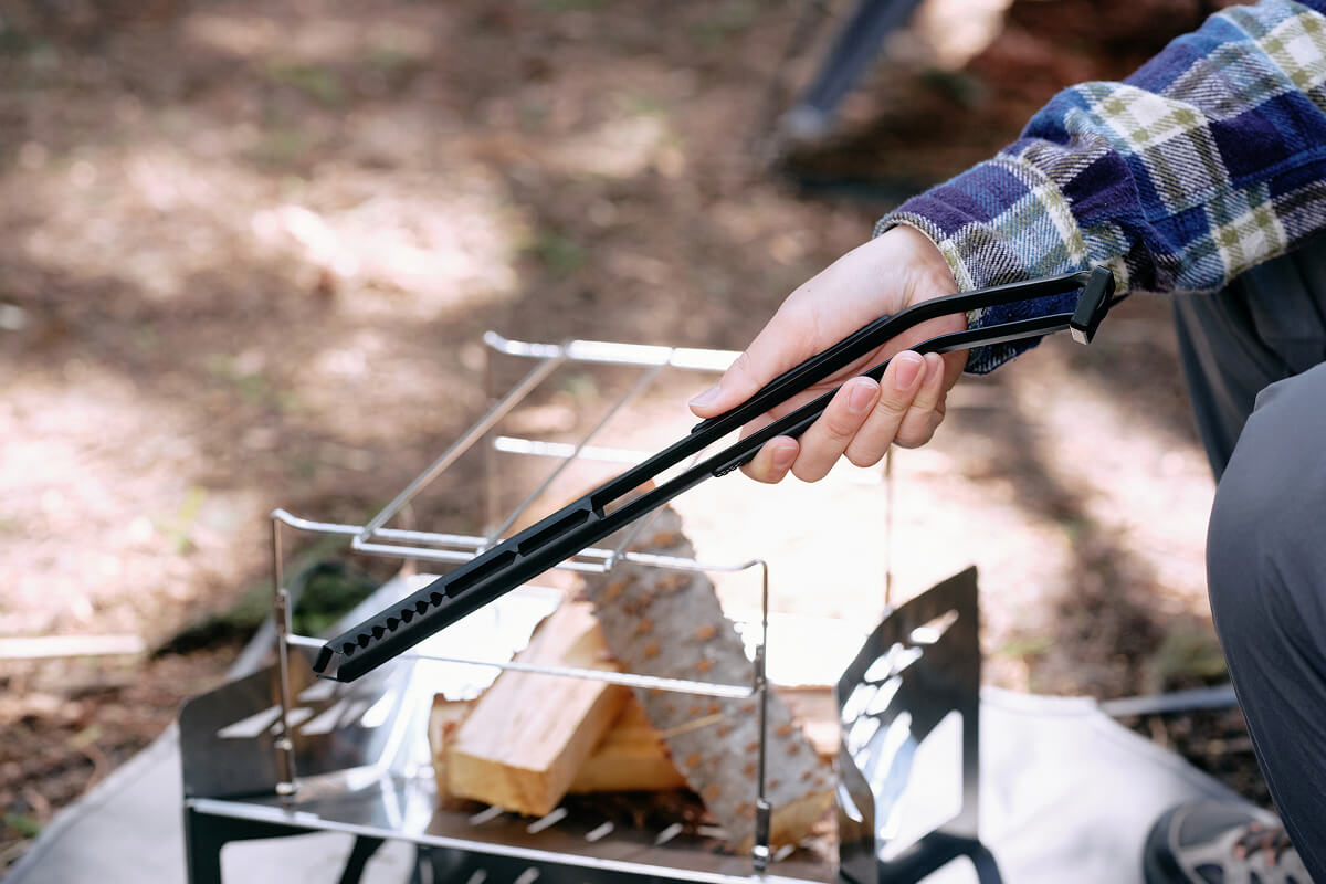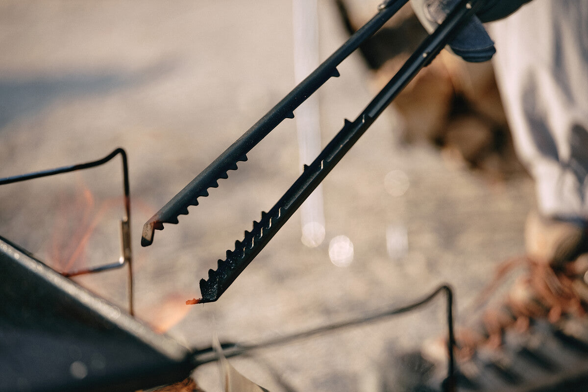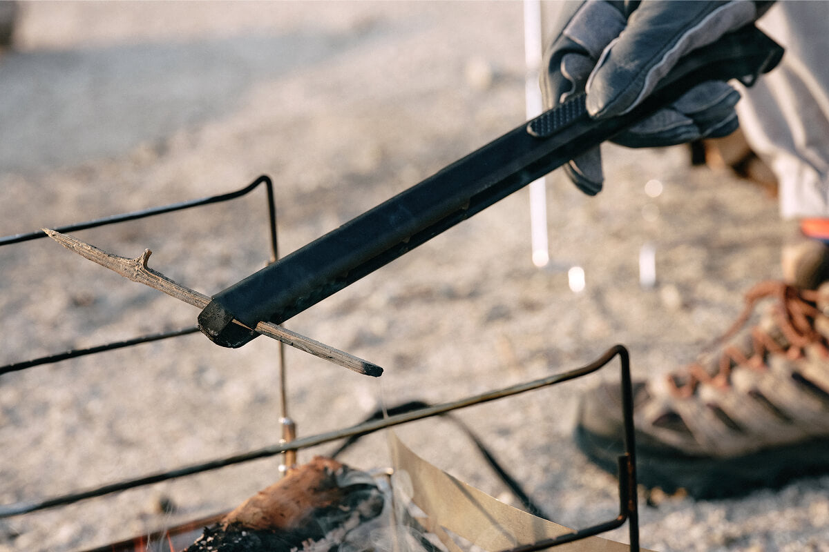 焚き火を自在にコントロールするために設計された薪トングです。