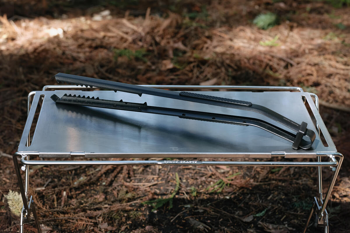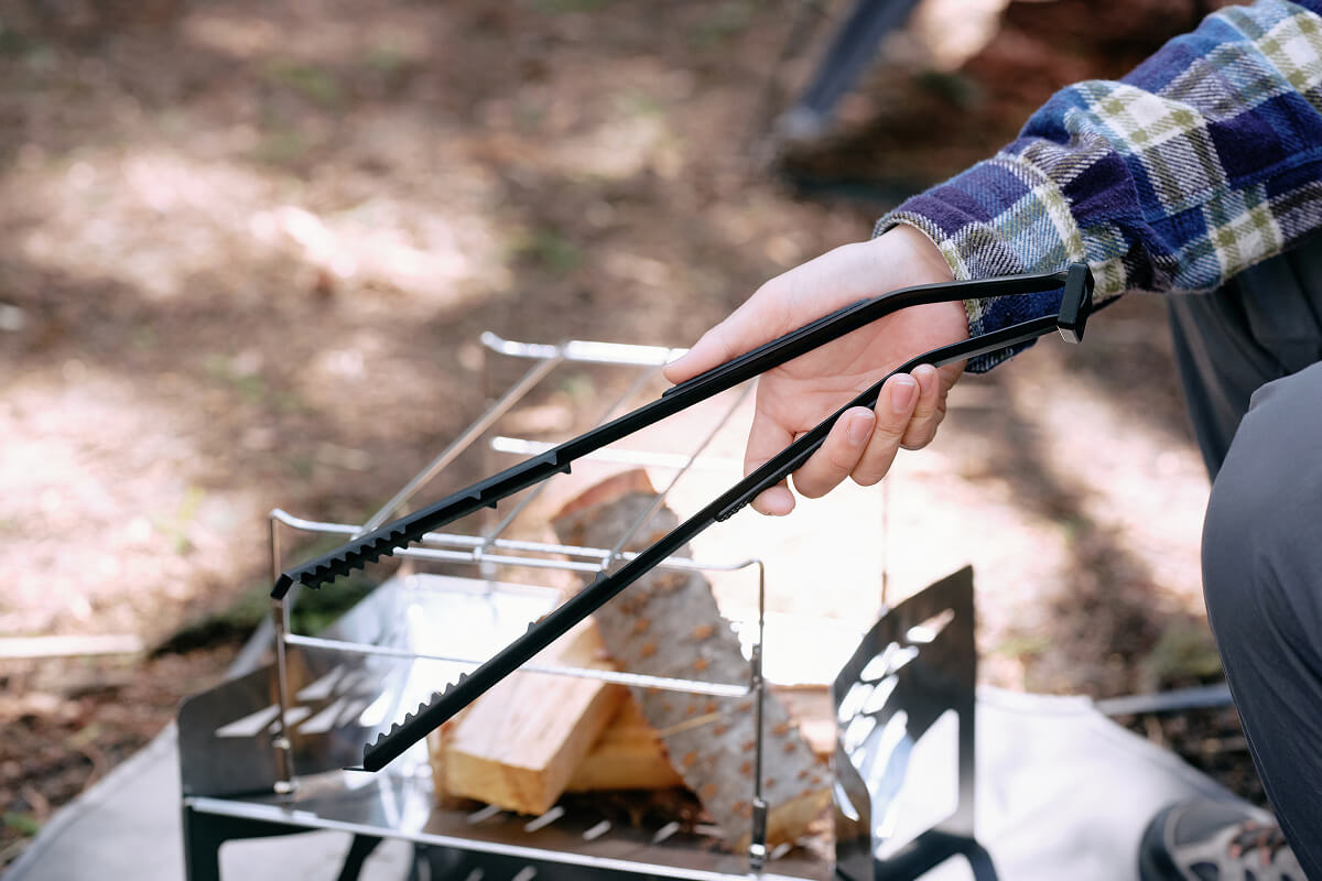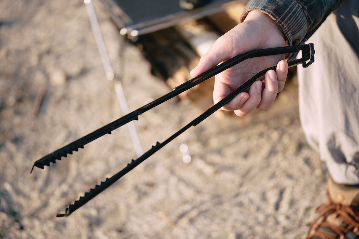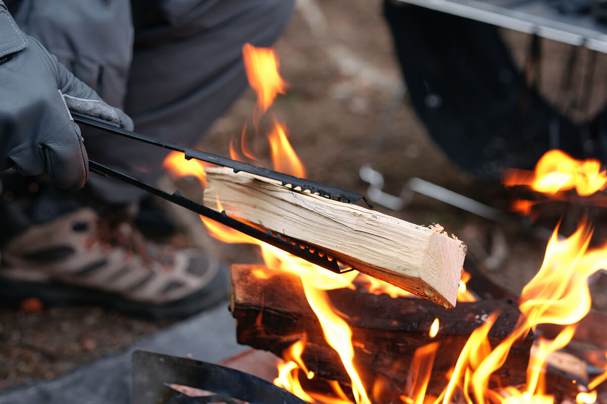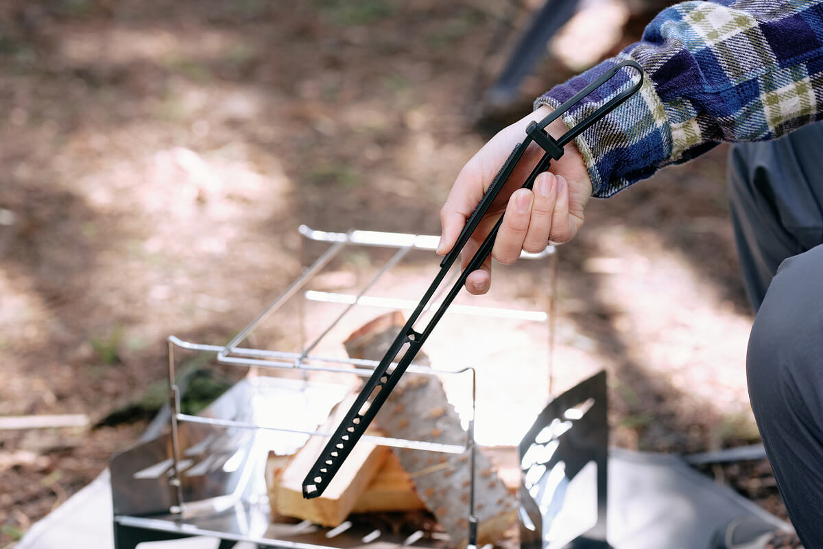 焚き火を自在にコントロールするために設計された薪トングです。