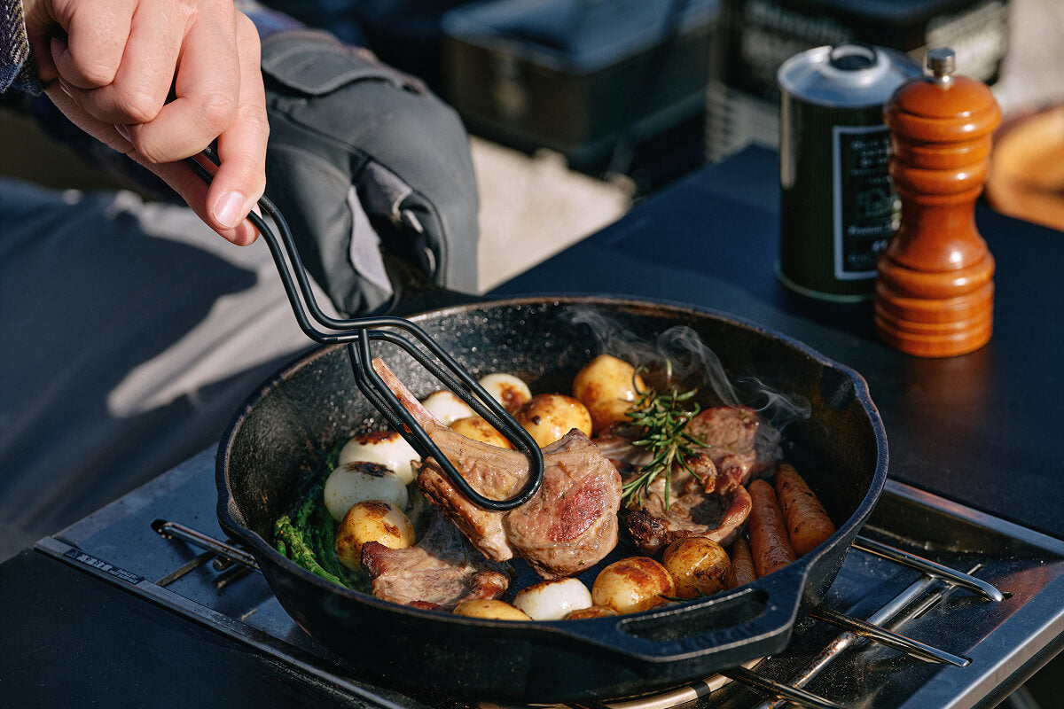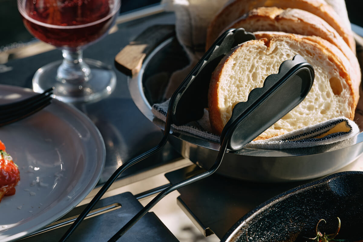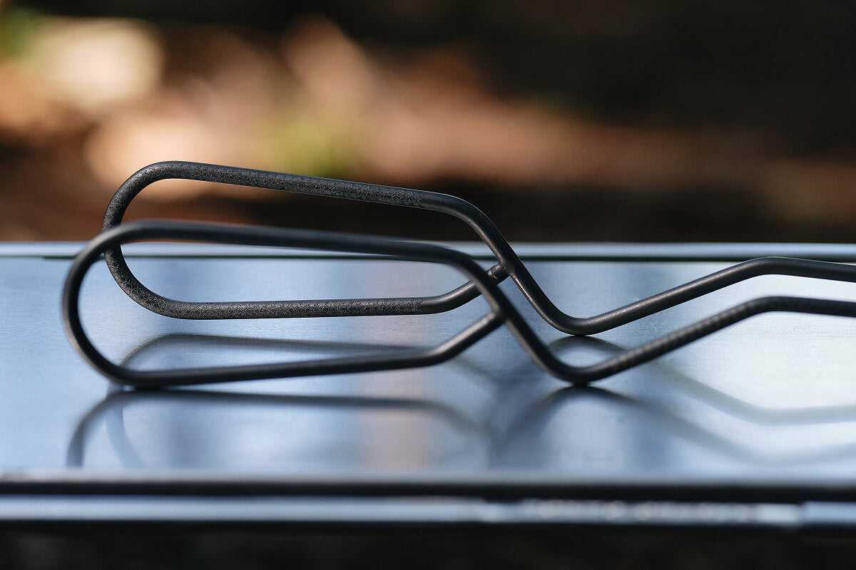 分厚い塊肉を力強く受け止めるための「安定感」を極めるために、一本のステンレス棒から不要な箇所をミリ単位で削り落とし、最高のバランスを導き出しました。さらに、付属のシリコンアタッチメントにより、グリルからサーブまで一本で完結する汎用性も実現。試行錯誤の末に辿り着いたこの形は、キャンプの調理という所作そのものを、より力強く、美しく変えてくれるはずです。