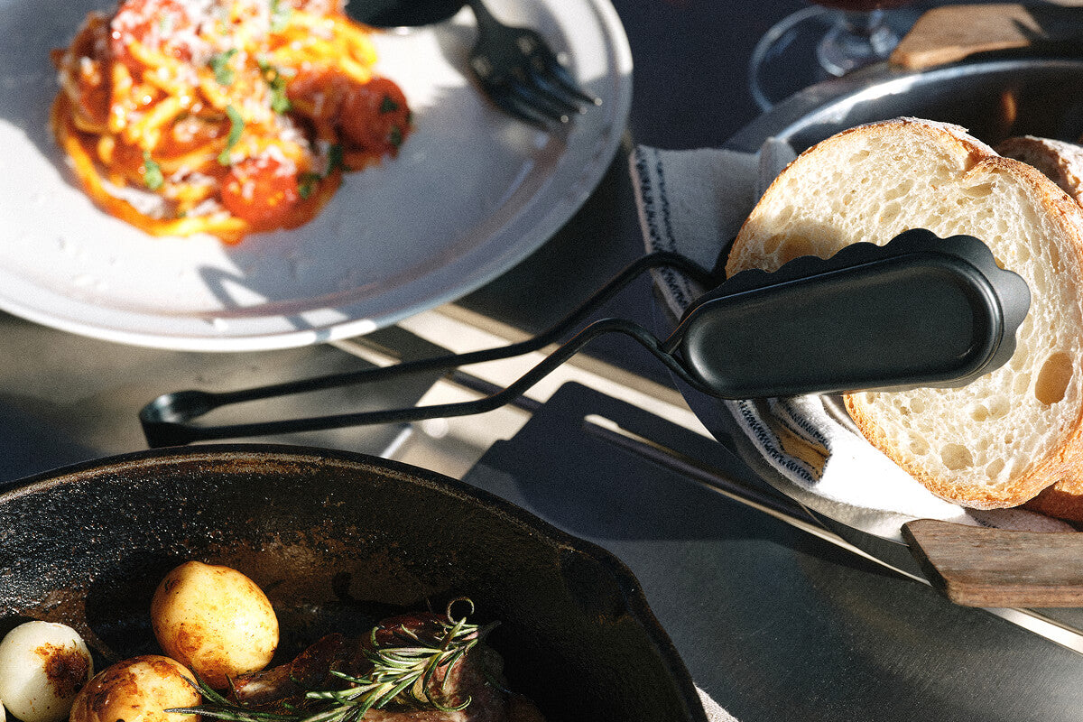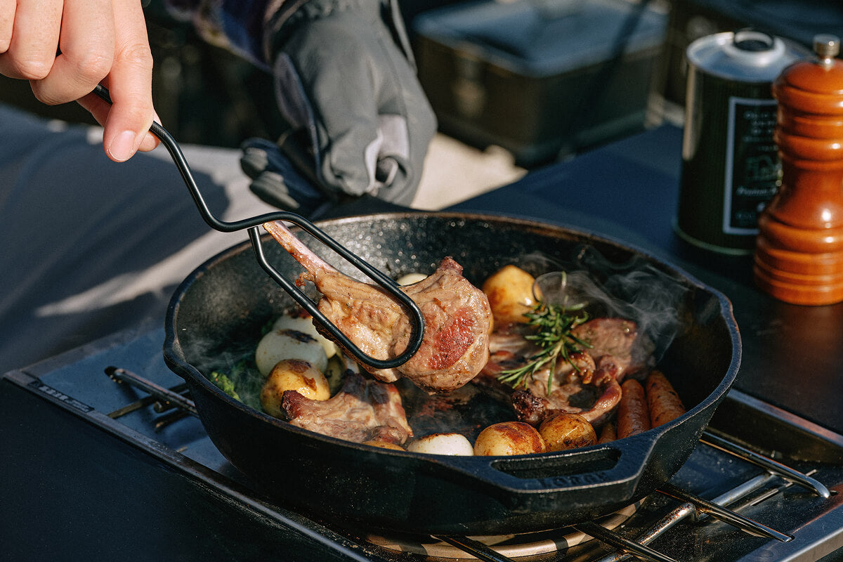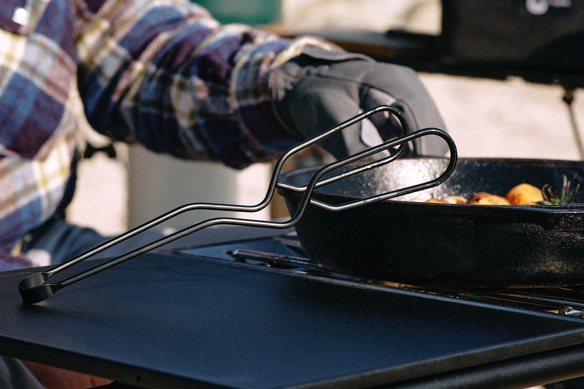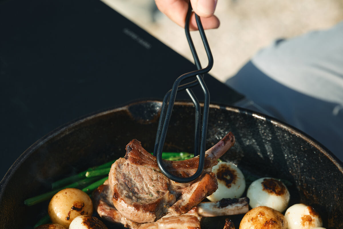 分厚い塊肉を力強く受け止めるための「安定感」を極めるために、一本のステンレス棒から不要な箇所をミリ単位で削り落とし、最高のバランスを導き出しました。さらに、付属のシリコンアタッチメントにより、グリルからサーブまで一本で完結する汎用性も実現。試行錯誤の末に辿り着いたこの形は、キャンプの調理という所作そのものを、より力強く、美しく変えてくれるはずです。