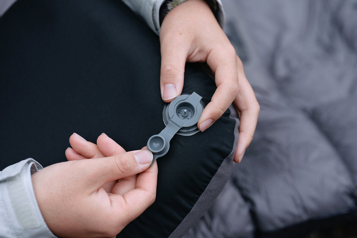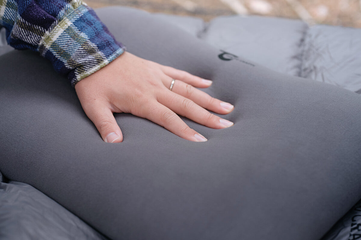 表面にウレタンフォーム、裏面にエアー層を組み合わせた二層構造のキャンプ用ピローです。頭が触れる面はウレタンの安定した沈み込みと起毛素材のさらりとした肌触り。それを支えるエアー層がクッション性と高さを生み出します。使わないときは空気を抜いて手のひらサイズに収納。ウレタンの寝心地を諦めず、エアピローの携帯性も手に入れた、いいとこ取りのキャンプ枕です。※ご使用には吸気ポンプが別途必要となります。